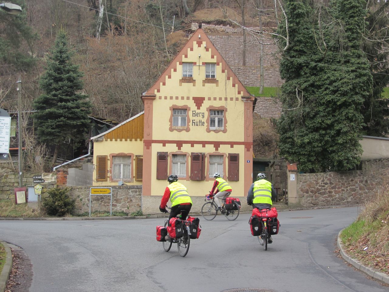 Vom Elbeufer haben wir einen Blick auf die Dresdener Vororte. Eine Elbeschleife kürzen wir ab und dann sind wir auch schon in Radebeul. Die steile Felswand müssen wir nicht emporradeln, es geht gemäßigt bergan.
