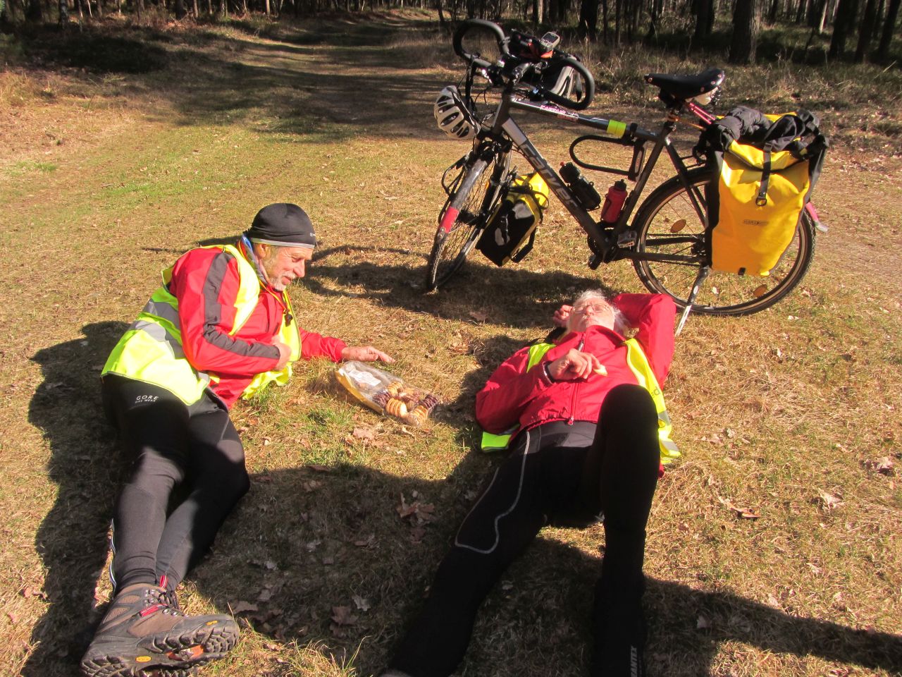 Dann finden wir einen sonnigen Platz, der uns zum Verweilen eindlädt, bis Klaus und Gerd zum Weiterfahren drängeln. Dann geht es den holprigen Waldweg hinunter. Klaus erwischt ein tiefes Schlagloch, und seine Lenkertasche wird durch den Schlag halb entleert. Brille, Geldbörse und sonstige Utensilien muss er wieder einsammeln.