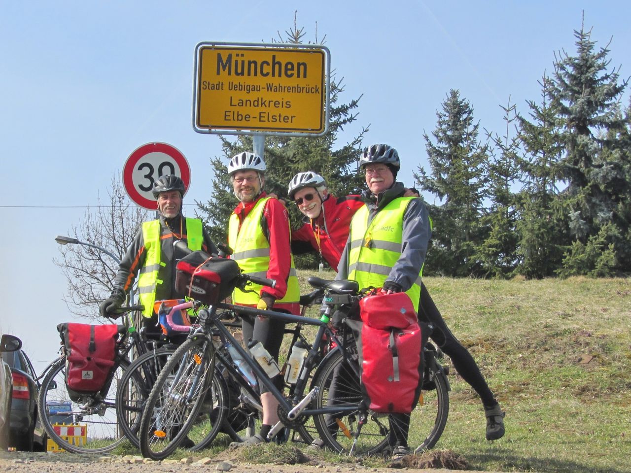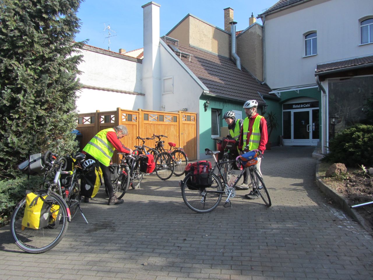 Gegen 9:00 Uhr packen wir die Räder; und wie man sieht es ist schon recht sonnig. Wir fahren wieder zur schwarzen Elster und fahren zumeist auf dem Deichradweg den Fluss hinunter.