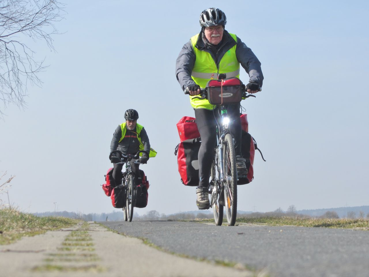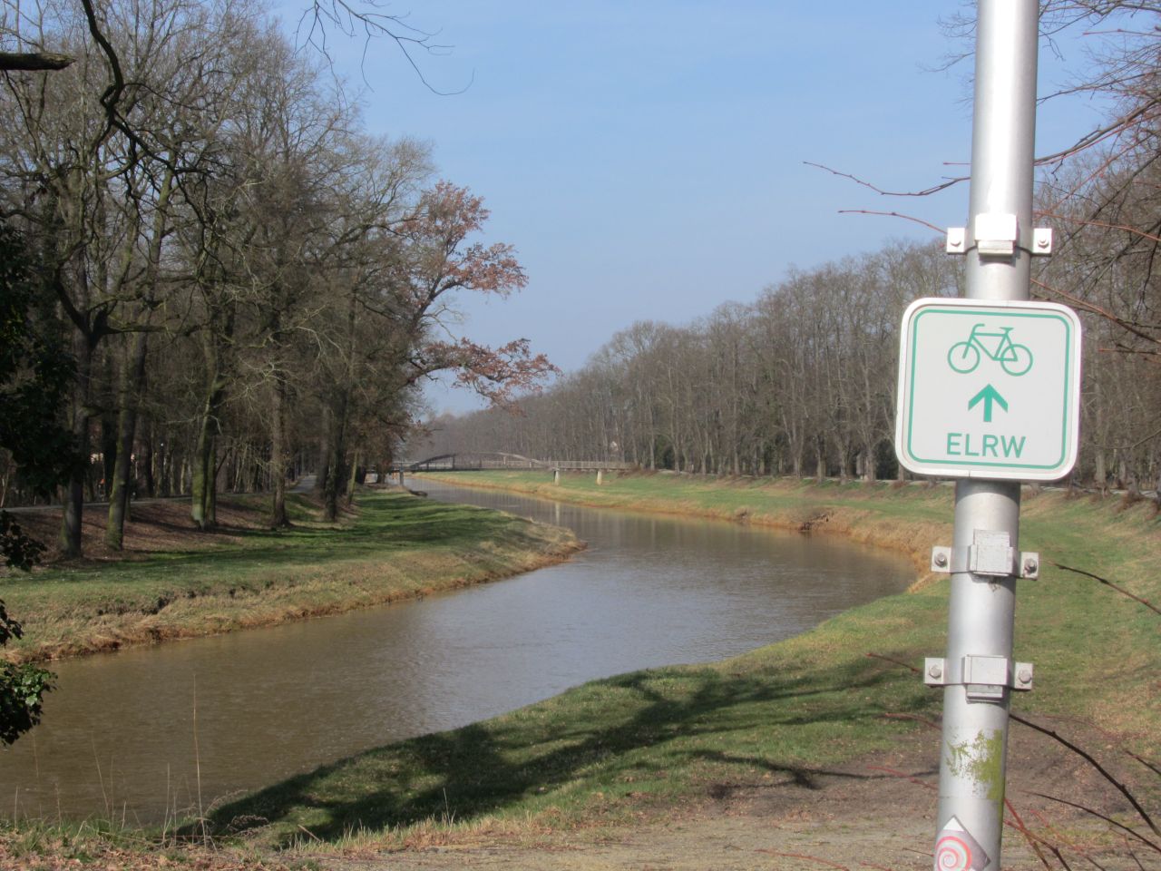 Die schwarze Elster ist hier zwischen den Deichen eingesperrt. Der Radweg verläuft auf der Deichkrone, meistens ist er asphaltiert, manchmal auch nur geschottert. Da wenig Wind herrscht, kommen wir flott voran.