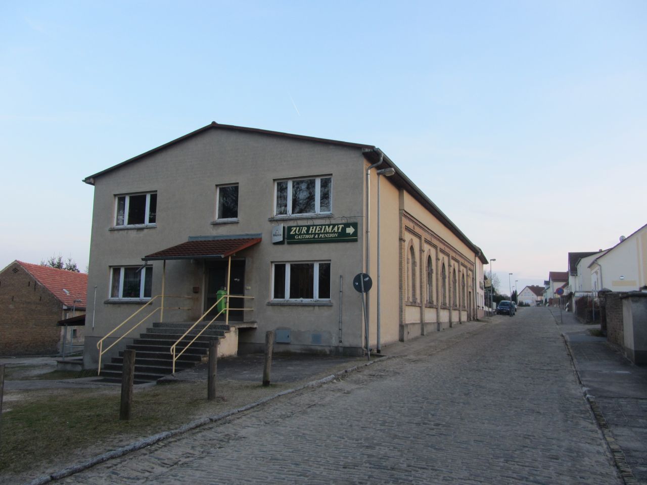 Die Pension „Heimat“ ist ein Gebäude aus der DDR-Zeit mit dem typischen grau-gelblichen Außenputz. Die Preise sind günstig und das Essen ist gut. Die Einrichtung ist etwas zusammengesucht, aber alles bestens und nicht überkandiert.