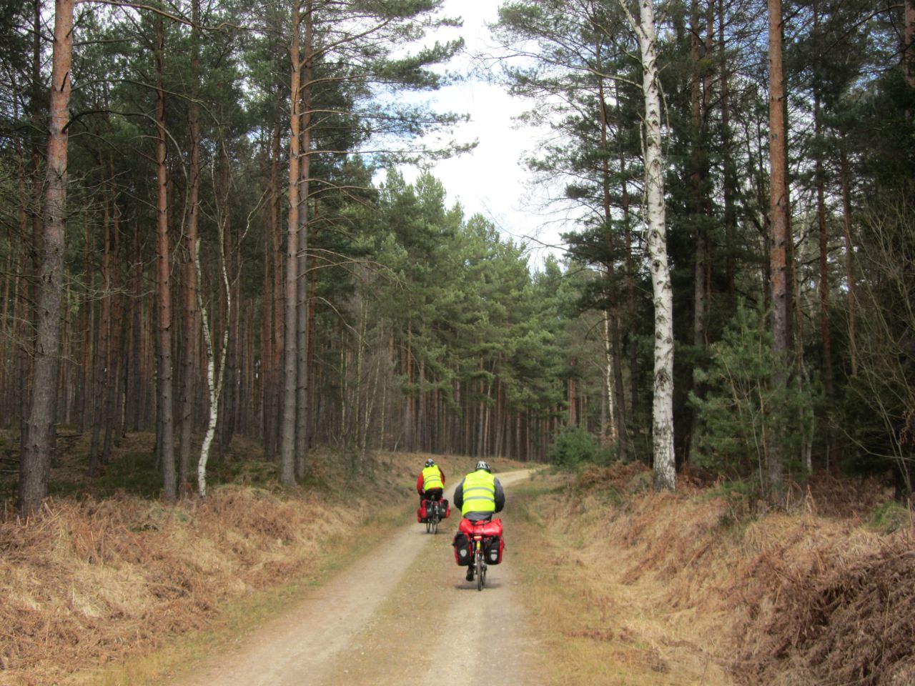 Dann finden wir einen sonnigen Platz, der uns zum Verweilen eindlädt, bis Klaus und Gerd zum Weiterfahren drängeln. Dann geht es den holprigen Waldweg hinunter. Klaus erwischt ein tiefes Schlagloch, und seine Lenkertasche wird durch den Schlag halb entleert. Brille, Geldbörse und sonstige Utensilien muss er wieder einsammeln.