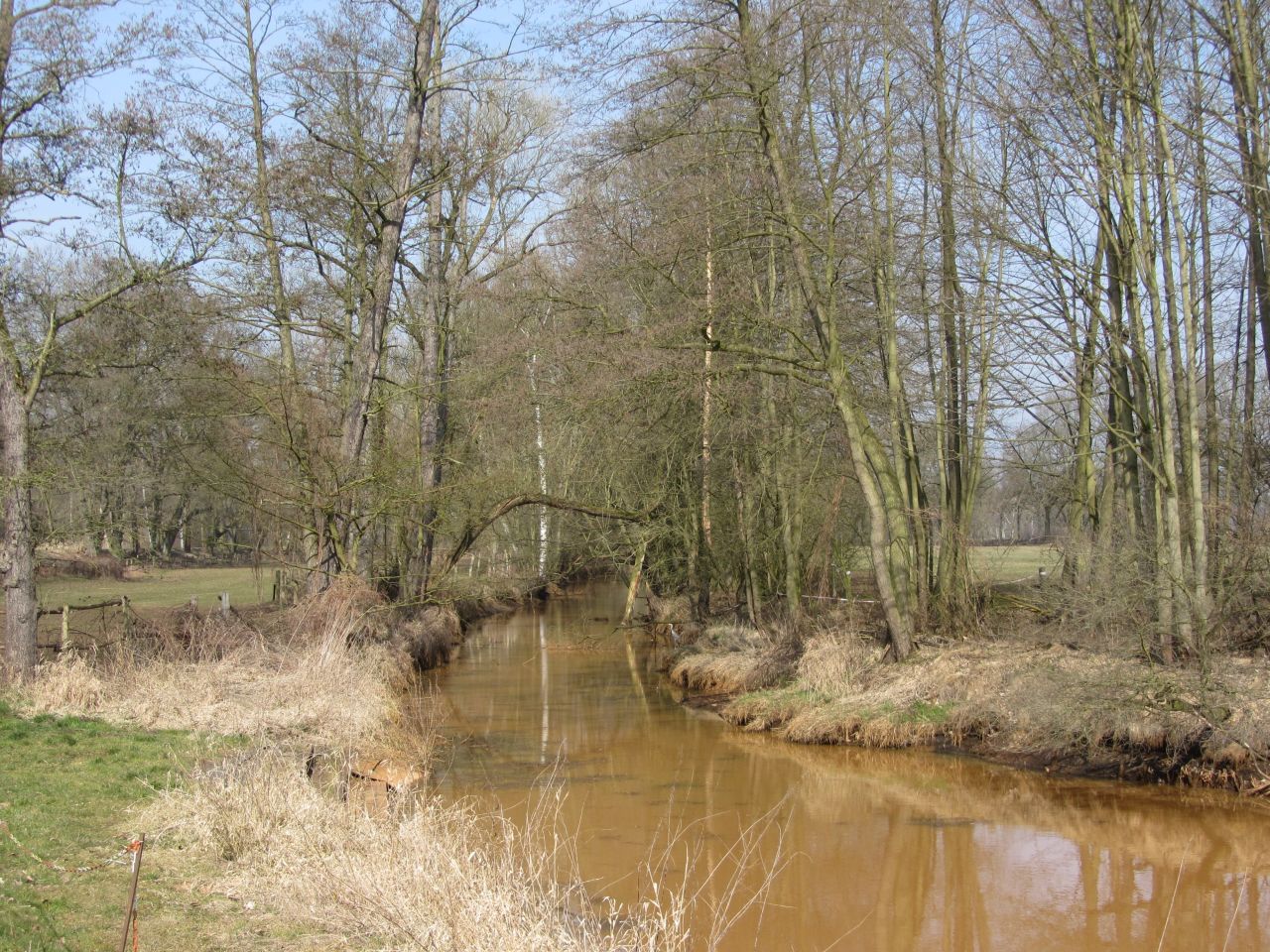 Die schwarze Elster ist hier zwischen den Deichen eingesperrt. Der Radweg verläuft auf der Deichkrone, meistens ist er asphaltiert, manchmal auch nur geschottert. Da wenig Wind herrscht, kommen wir flott voran.
