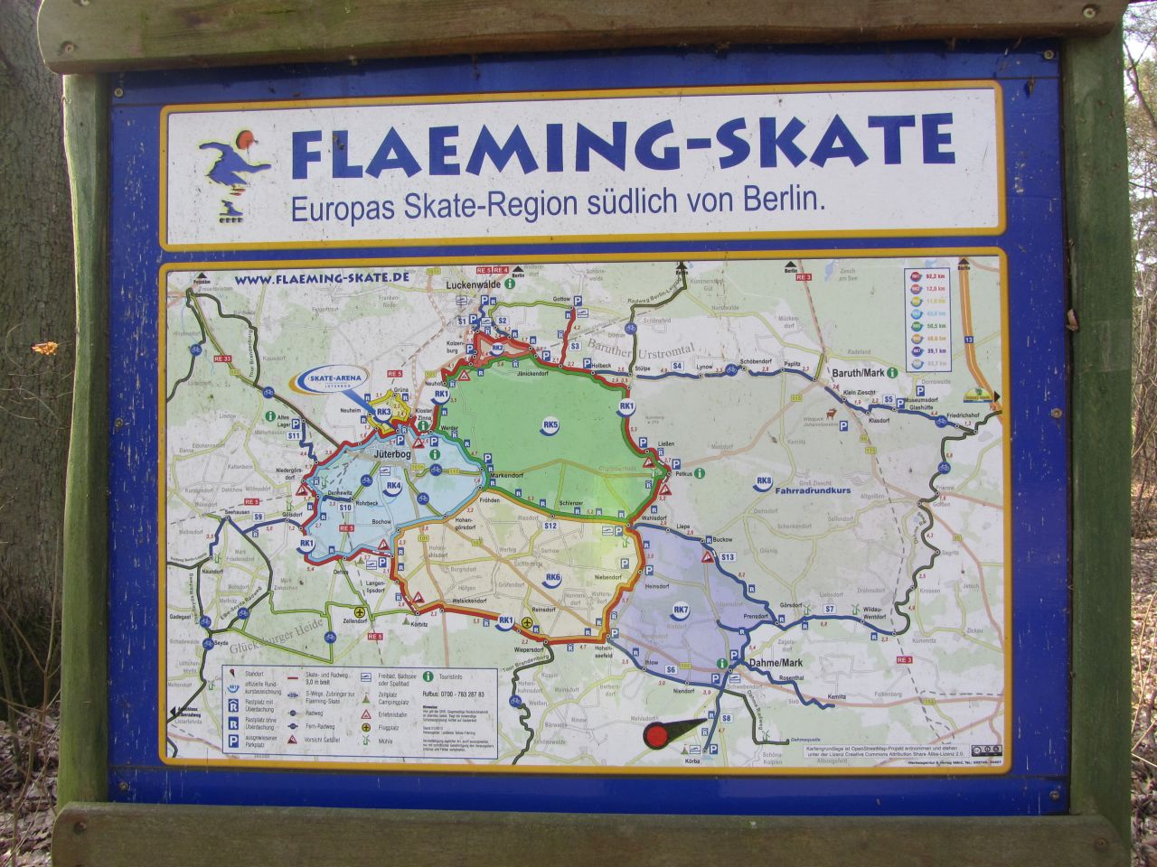 Wir sind im Bereich des Flaeming-Skates. In dem Dreieck Jüterborg, Dahme und Luckenwalde gibt es ein hervorragendes Netz von Wegen für Fahrradfahrer und Skater. Die Wege sind glatt asphaltiert und verlaufen quer durch die Wälder und durch die Dörfer. Man kommt hier fast unbehelligt vom motorisierten Verkehr komfortabel voran. Es geht teils durch Kiefern- und Birkenwälder und dann gibt es Abschnitte im offenen Terrain. Das Gebiet ist jedenfalls schwach besiedelt.