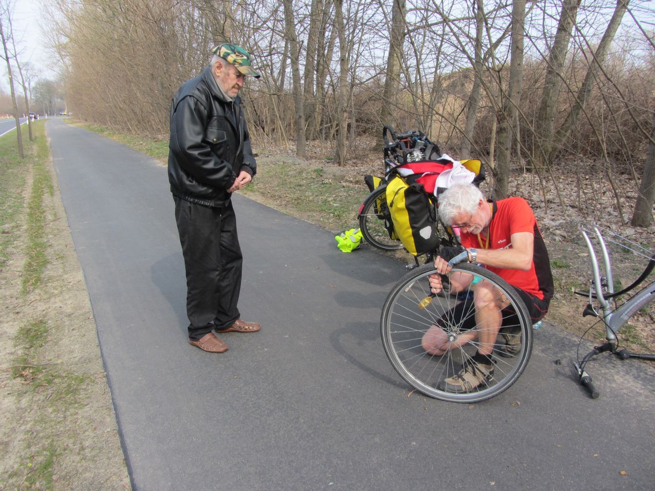 Nach der Reparatur bedankt er sich herzlich und er ist froh, das Rad nicht kilometerweit schieben zu müssen.