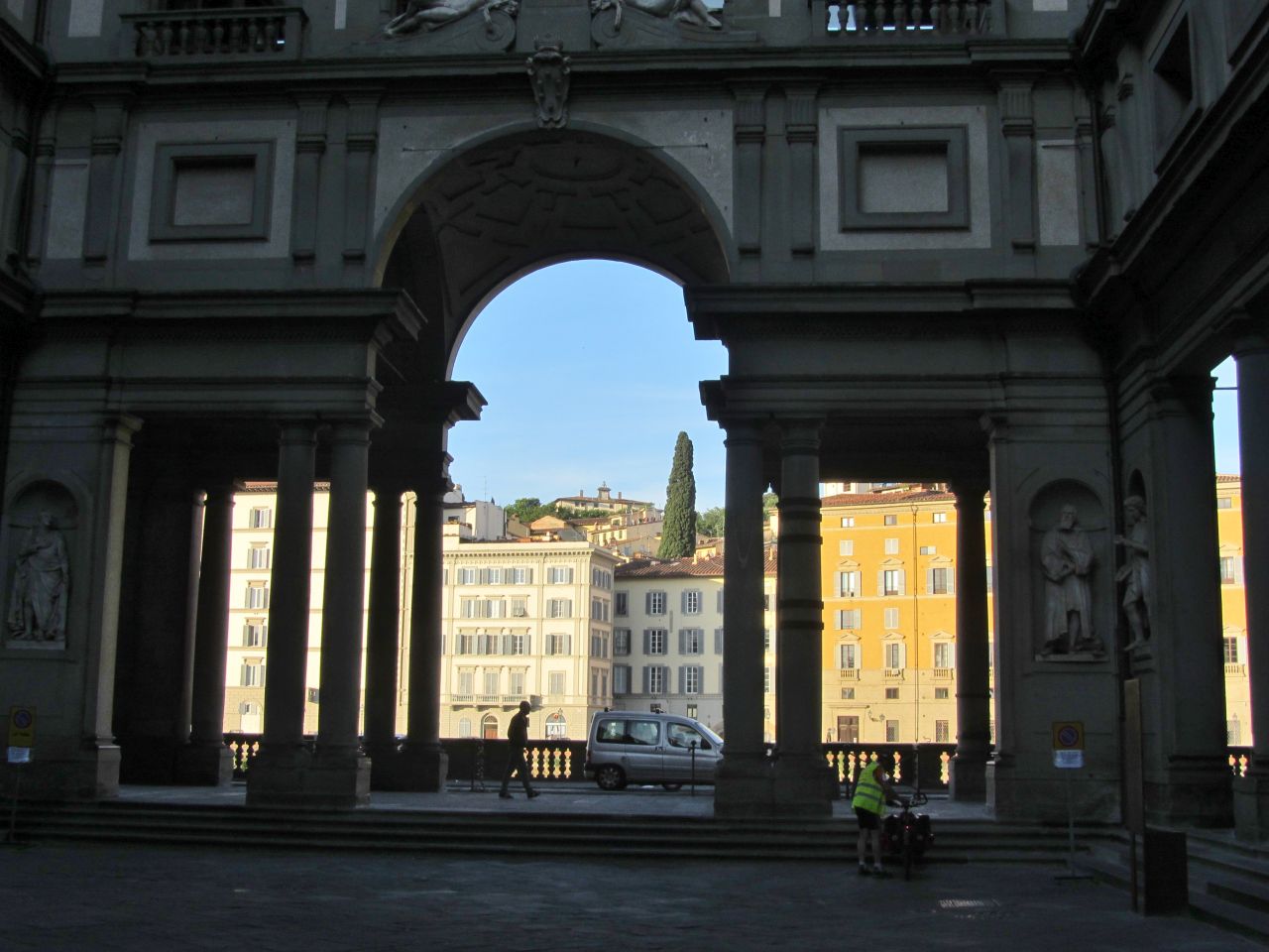Und so erreichen wir wieder den Arno und bald darauf die Provinzhauptstadt Arezzo. Durch die Porta San Lorentino, als Teil der Stadtbefestigung, erreichen wir die Innenstadt. In einem Fahrradladen sucht Heinz nach Radschuhen, da er die zuhause vergessen hat. Aber die Italiener haben kleine Füße; Größe 44 sind hier schon Riesenfüße und die Größe ist nicht verfügbar; und so bleibts beim Heinz bei den Turnschuhen.
