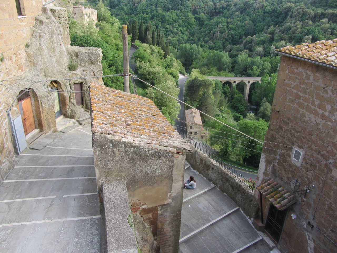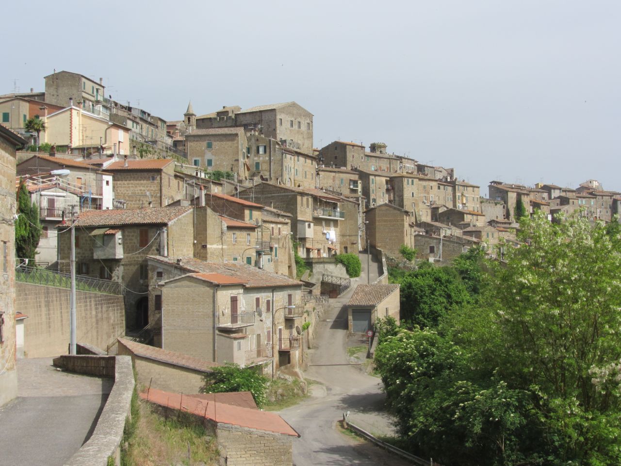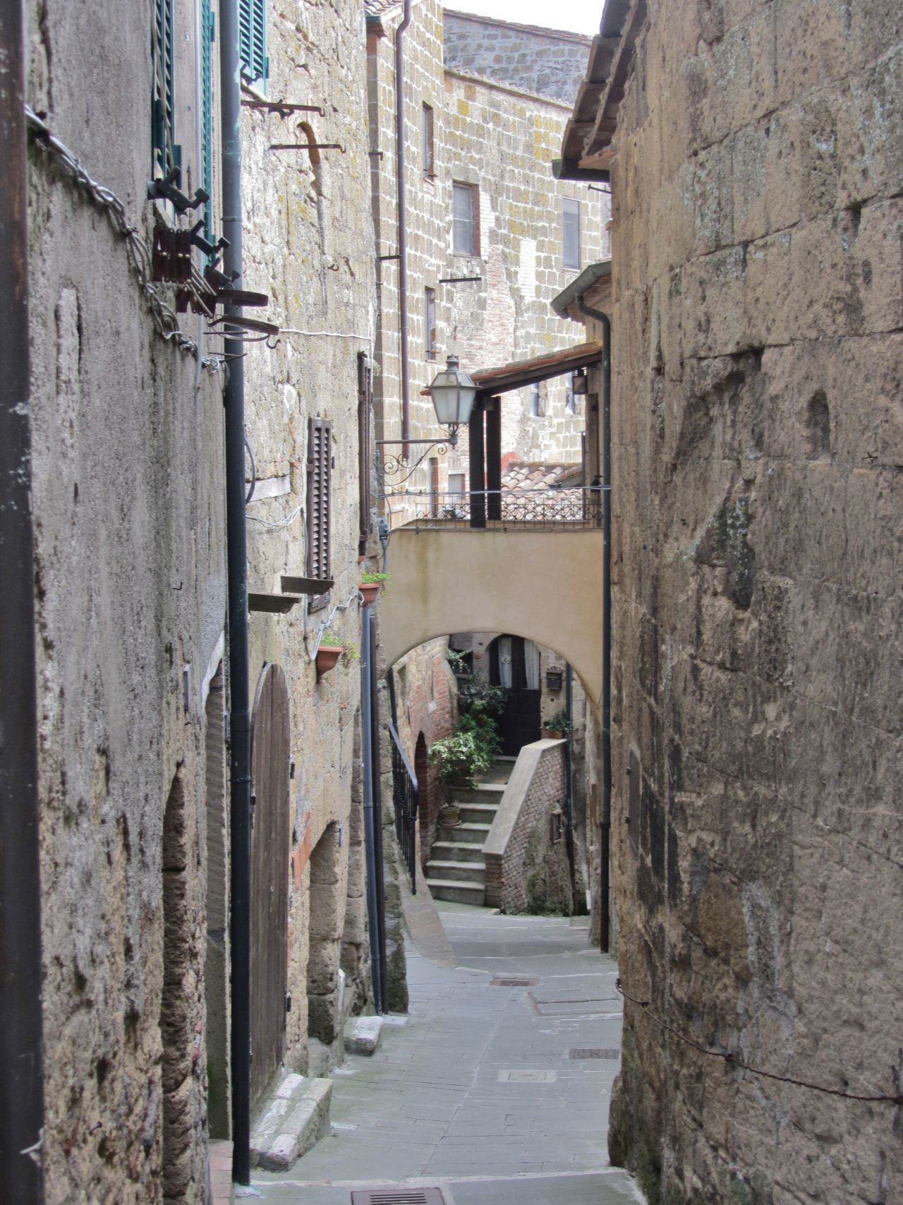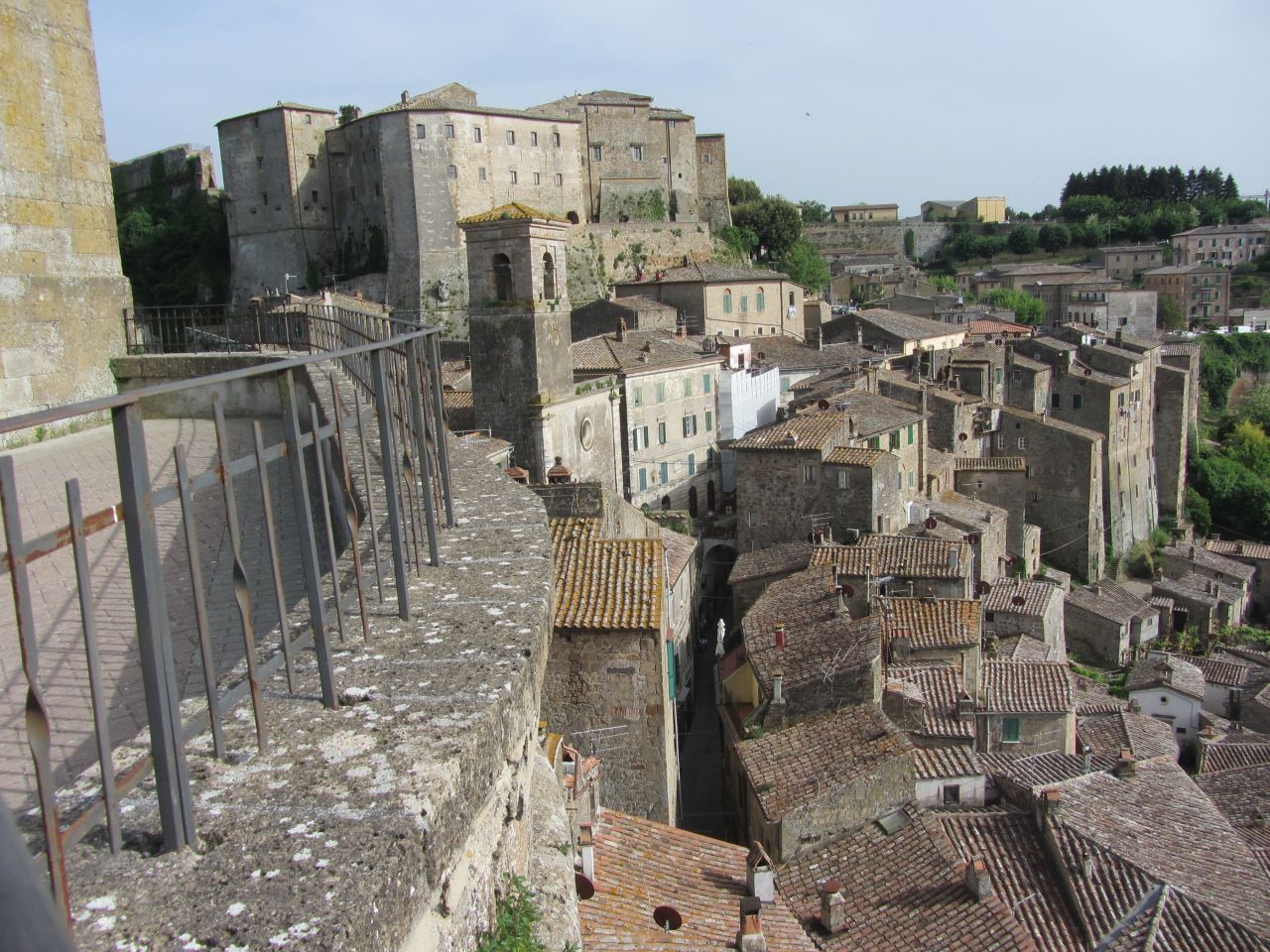 Die Gebäude bestehen aus Tuffstein; es gibt ganz enge Gassen und ich finde mit dem Rad einen Weg fast bis zur oberen Ebene des Dorfes. Von hier kann man ins das Tal zurückschauen und auf die Gebäude von Sorano blicken.