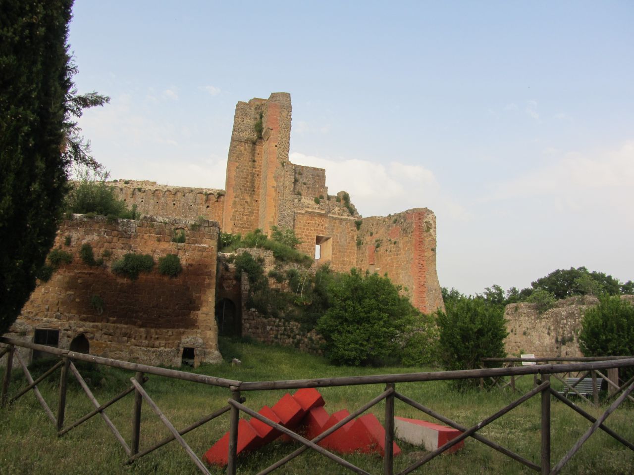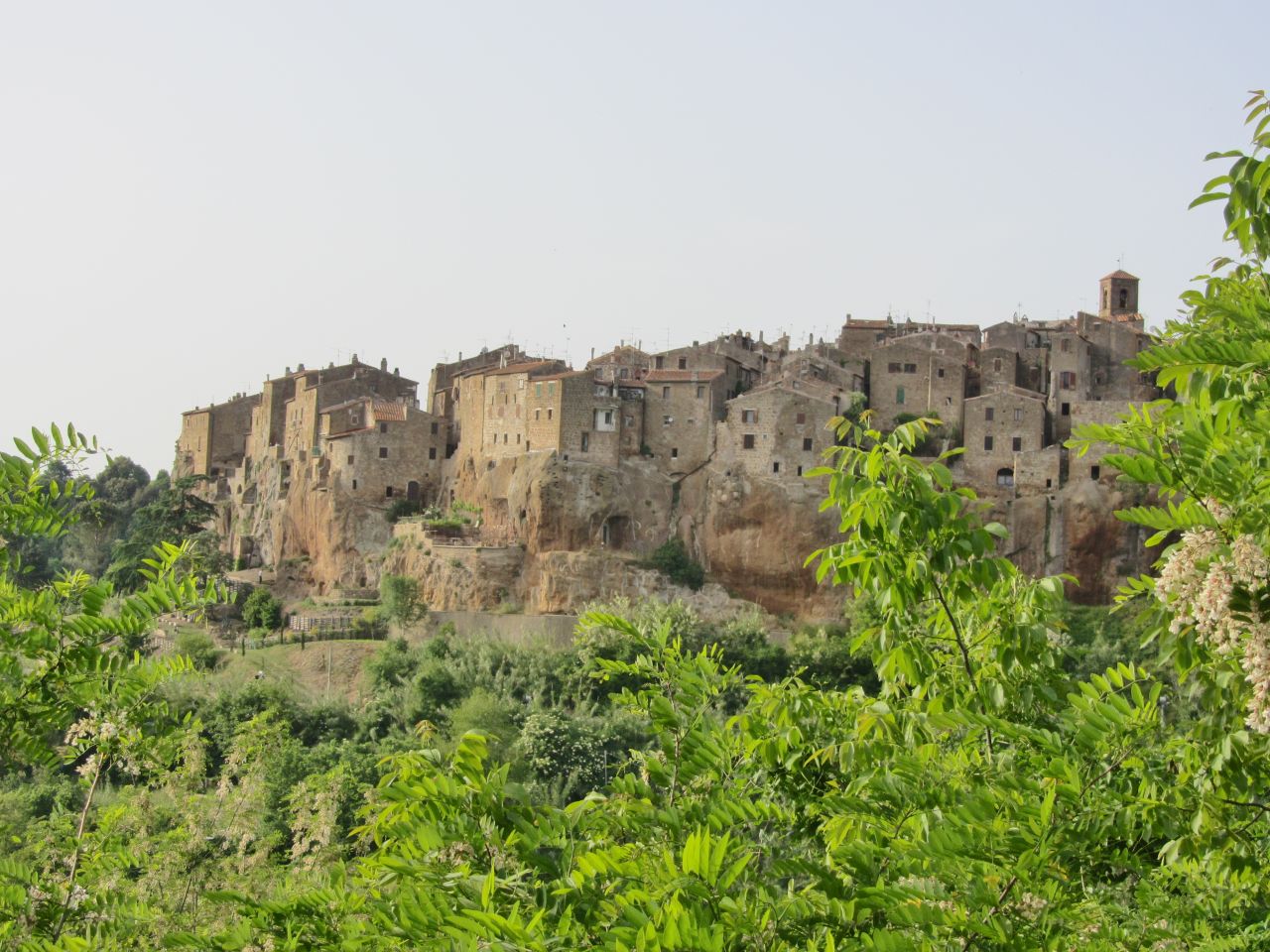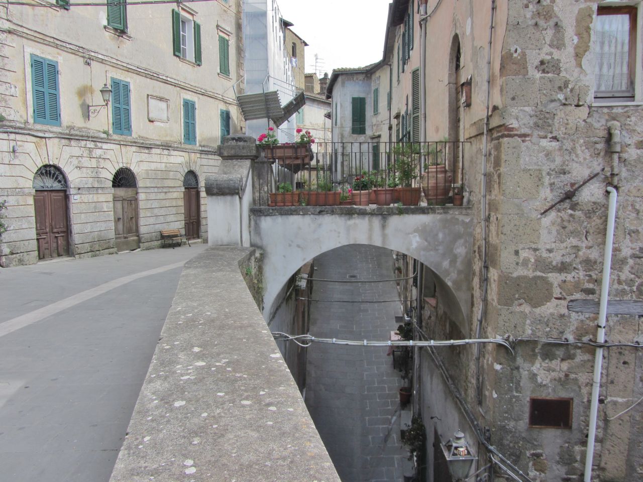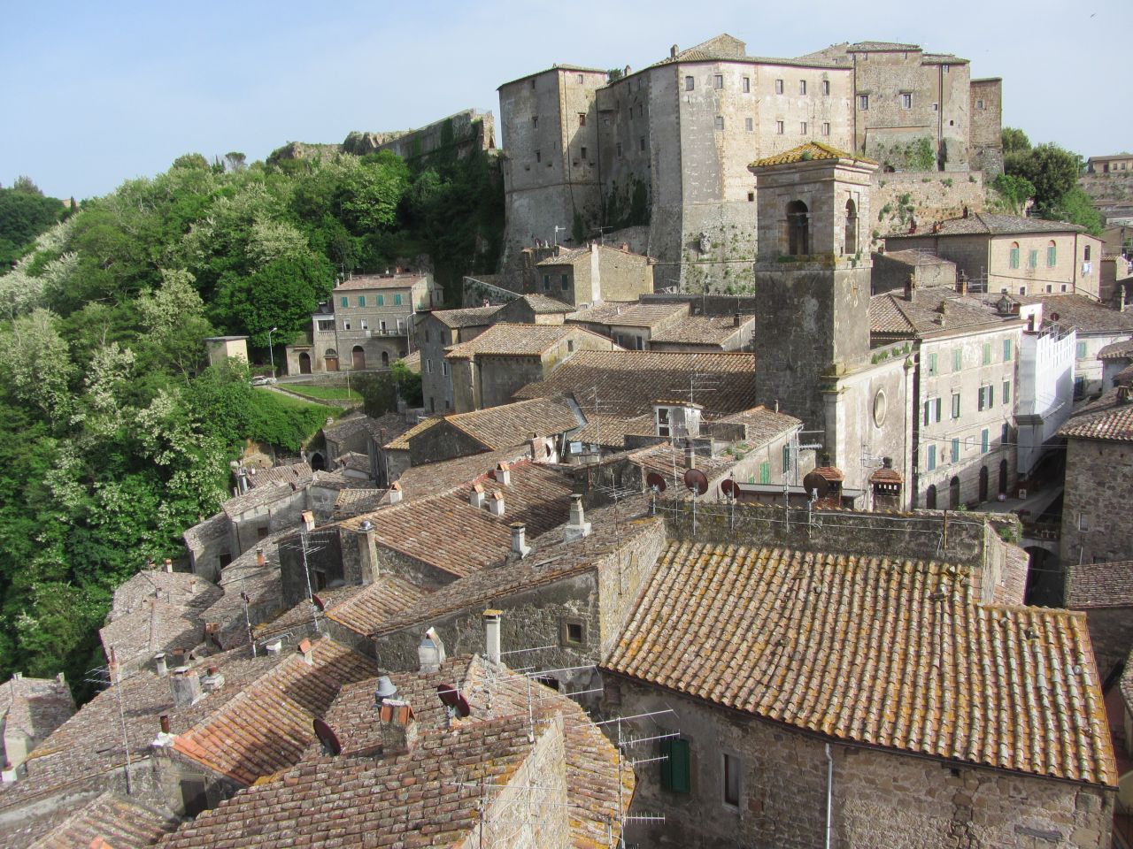 Die Gebäude bestehen aus Tuffstein; es gibt ganz enge Gassen und ich finde mit dem Rad einen Weg fast bis zur oberen Ebene des Dorfes. Von hier kann man ins das Tal zurückschauen und auf die Gebäude von Sorano blicken.