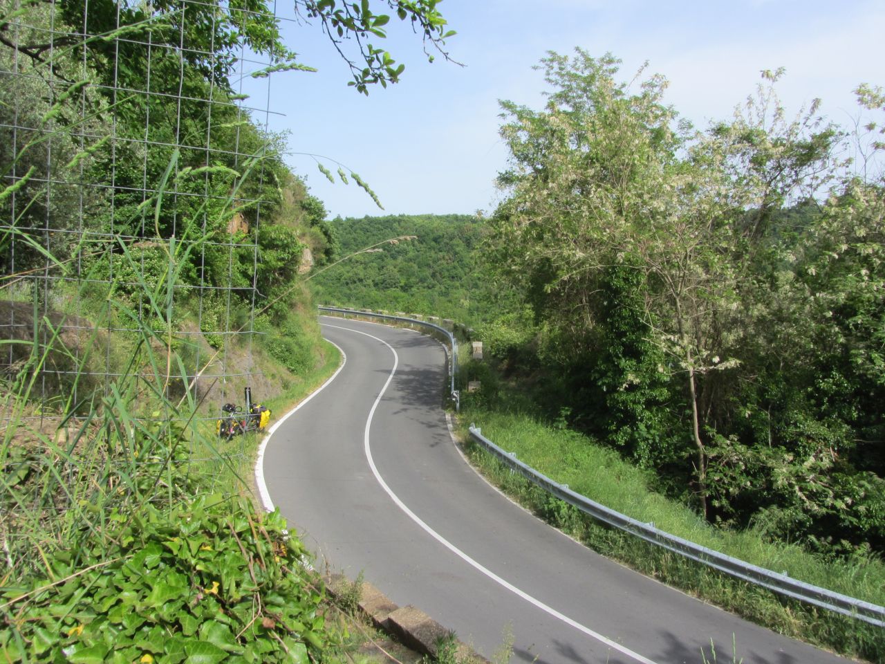 Hinter Gradoli legen wir noch einen großen Bogen ein. Hier gibt es Kornfelder und den für Italien untypischen Kartoffelanbau. Es ist eine weite offene Hügellandschaft und im Hintergrund türmen sich hohe Berge auf.