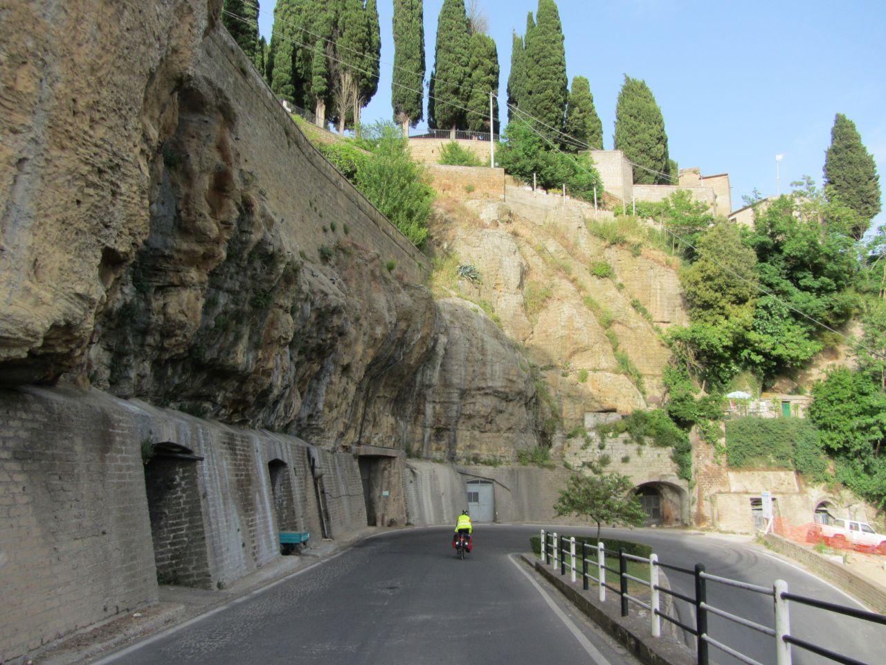 Dann noch ein paar steil Serpentinen und wir sind in dem Ort Pitigliano. Zuerst passieren wir einige Weingeschäfte, die in dem Tuffstein am Straßenhang eingebettet sind.