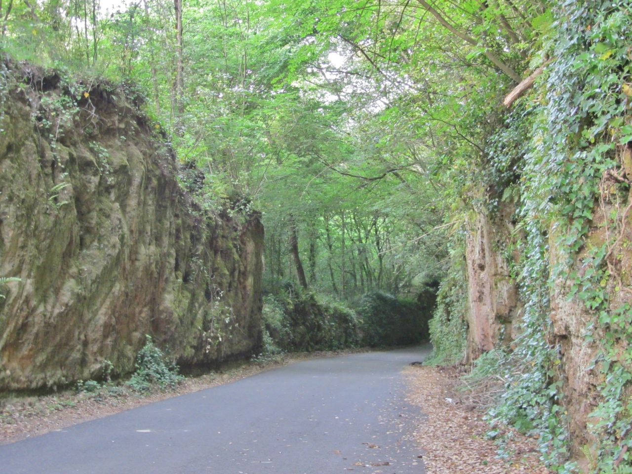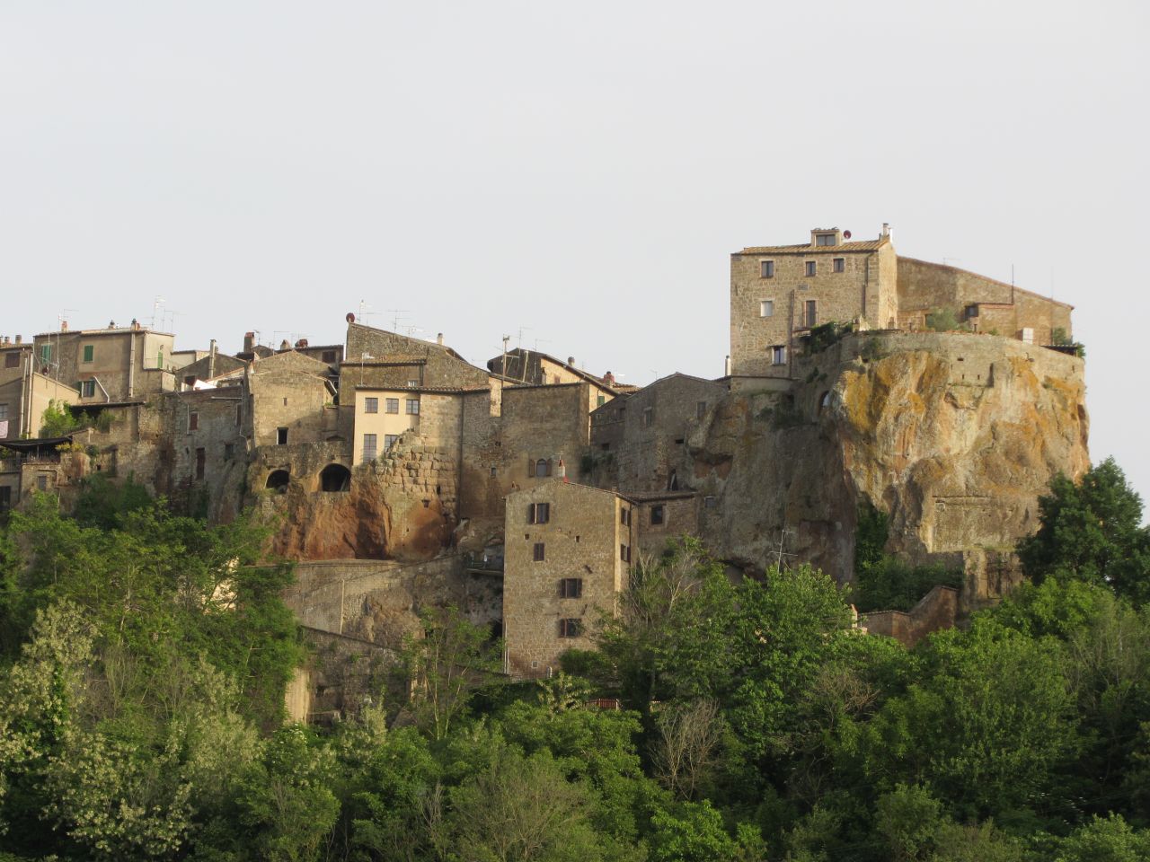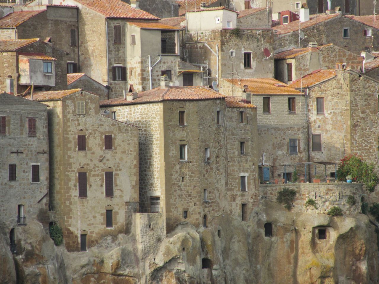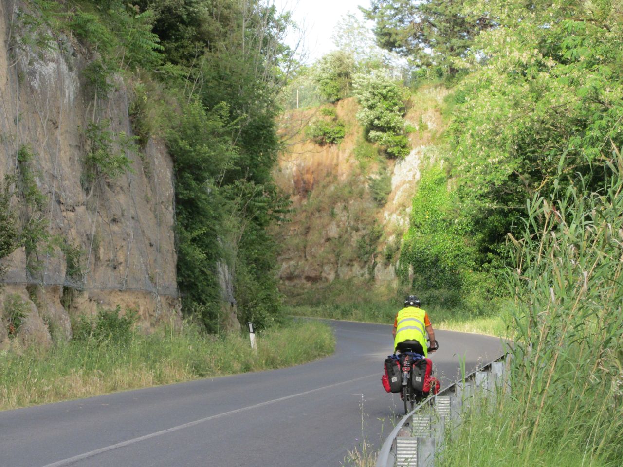 Dann sehen wir den Ort Sorano von einer Brücke im Gegenlicht. Wir passieren an den Tuffsteinhängen ausgehölte Räume, die mit Türen verschlossen sind, Garagen, Champignonzucht.. Wir haben nicht herausbekommen, wozu die Räume genutzt werden.