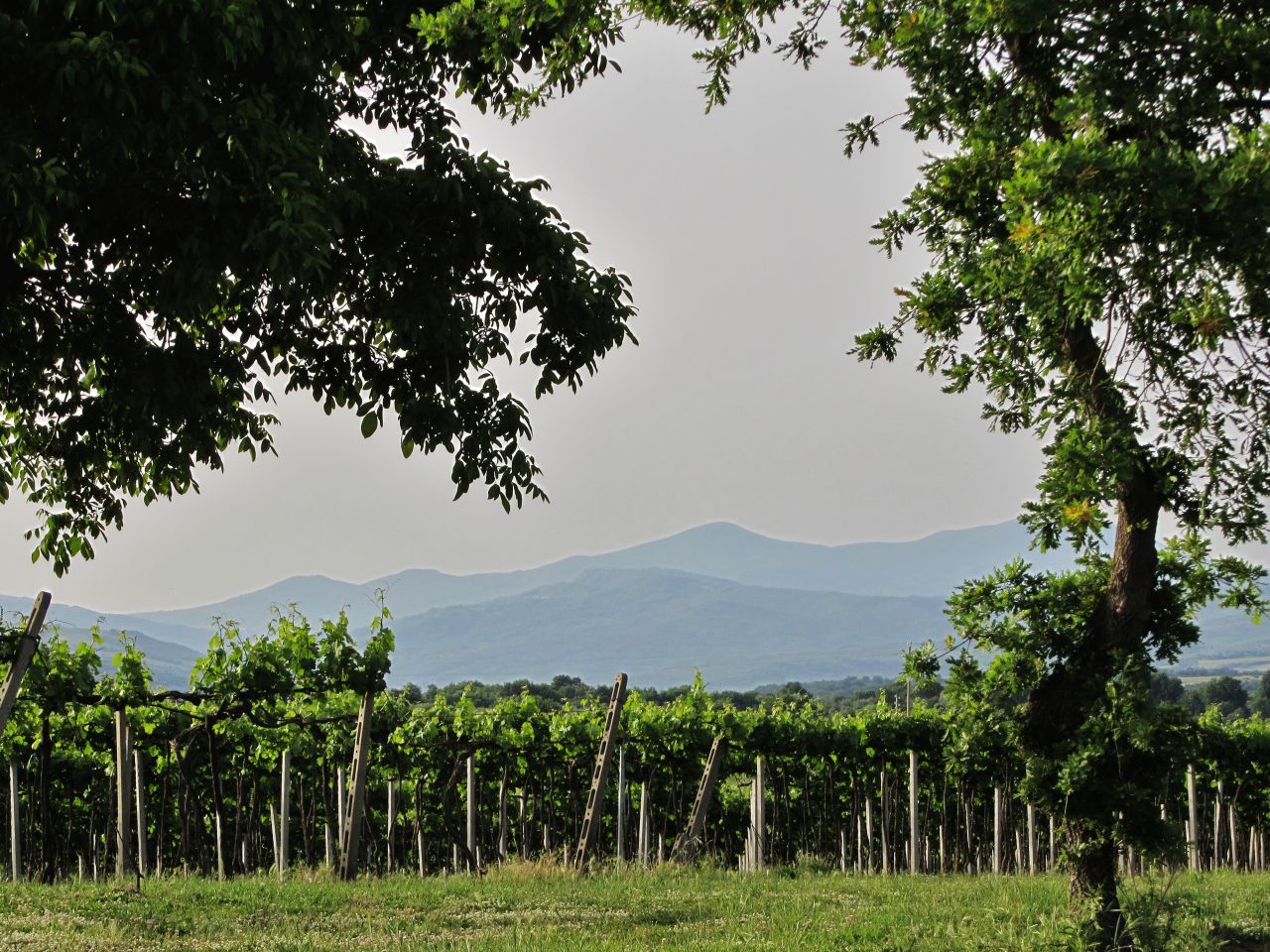 Dann wird die Landschaft wieder offener; viel Weinanbau und bunte Farben beim einsetzenden Sonnenuntergang. Im Hintergrund befinden sich wieder die Berge.