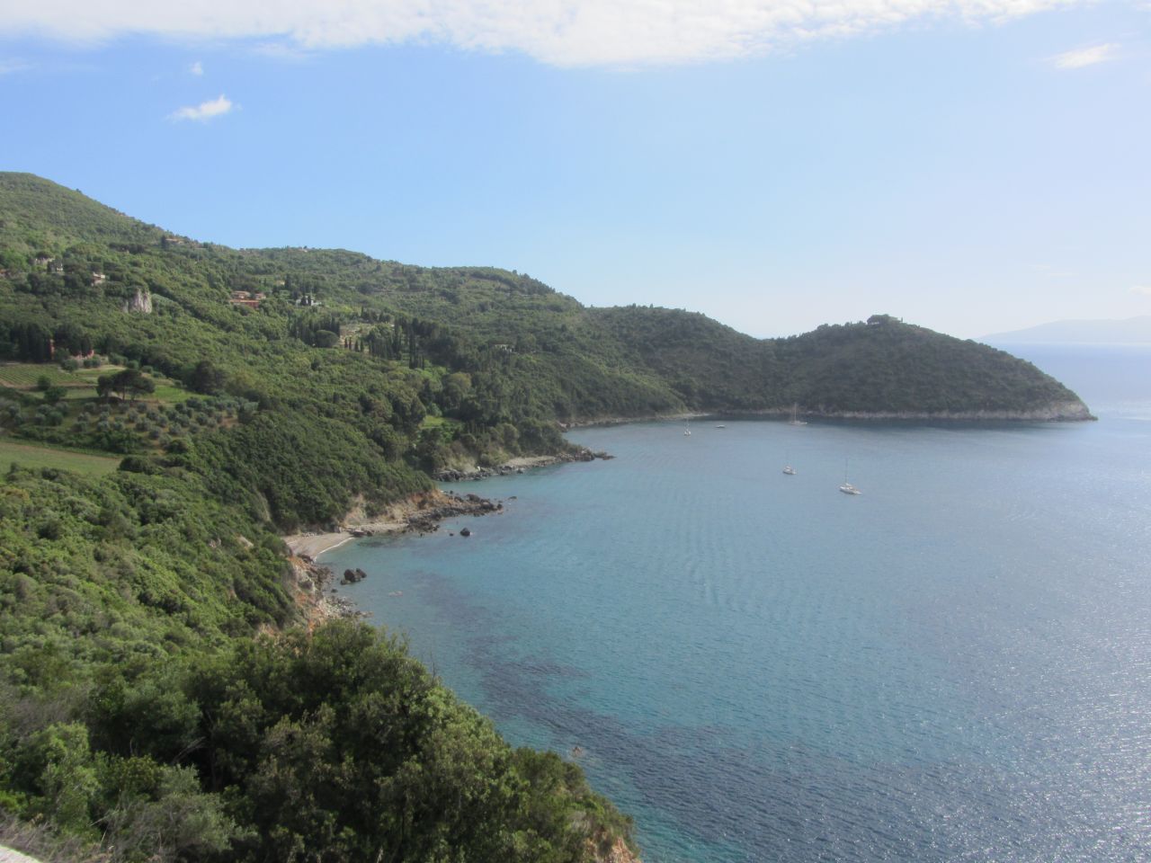 Zuerst haben wir einen flachen Küstenverlauf. In Ansedonia treffen wir auf eine Steilküste und vor dem Bergmassiv baden wir im Thyrrenischen Meer. Wir sind die Einzigsten bei der geschätzten Wassertemperatur von 18 °C, die sich ins Wasser stürzen. Der Wellengang ist recht heftig und der Sand sammelt sich in der Badehose. Danach kommen wir durch den Ort Orbetello und dann landen wir auf der Halbinsel des Monte Argentario.