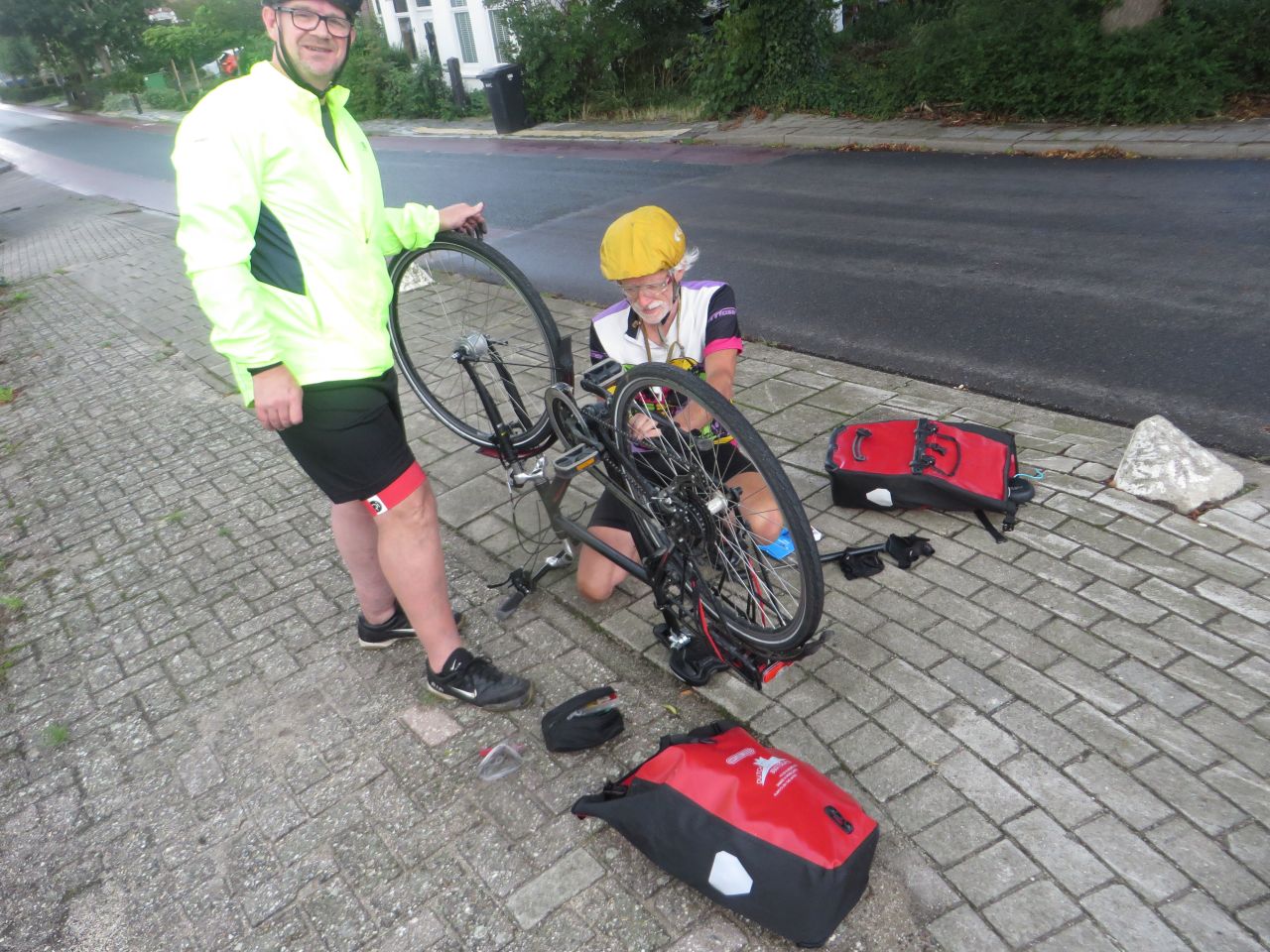 Dann bitte uns ein holländischer Radfahrer um Hilfe. Seine Kette hat sich zwischen Kettenblatt und Sattelrohr verkeilt. Nach einigen Versuchen mit dem Schraubendreher können wir die Kette wieder freigängig machen.