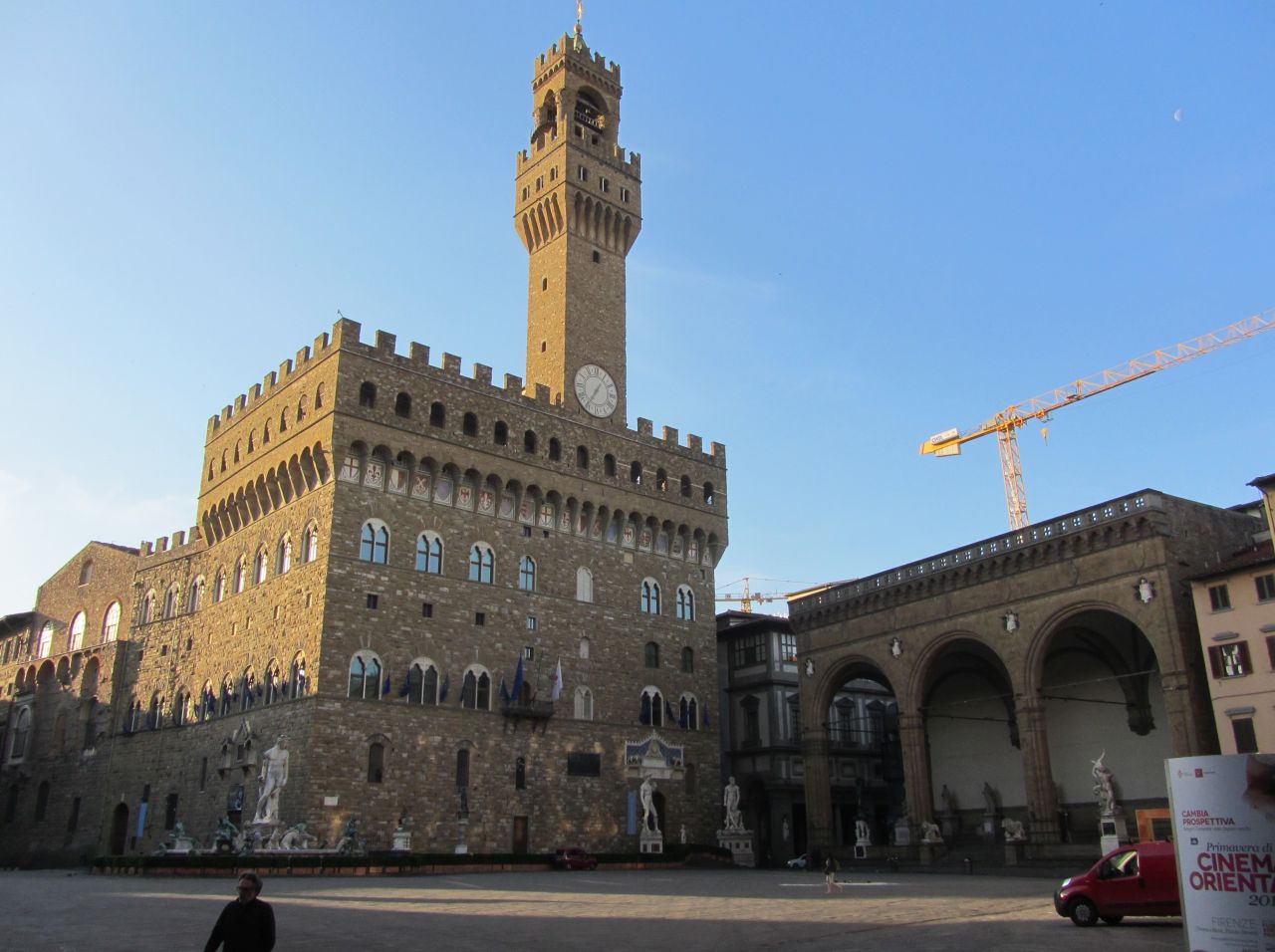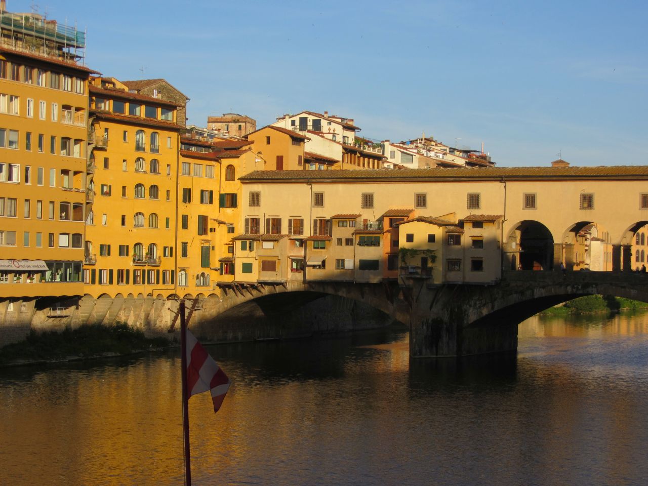 Am Ufer schaut man rechts auf die Ponte Vecchio. Toll.. die Brücke ist überbaut und es kleben kleine Hausfassaden an dem Mauerwerk, in denen Touristenläden untergebracht sind. Aber jetzt um 7 Uhr geht es noch beschaulich zu.