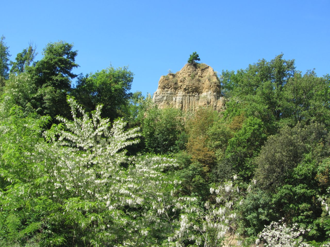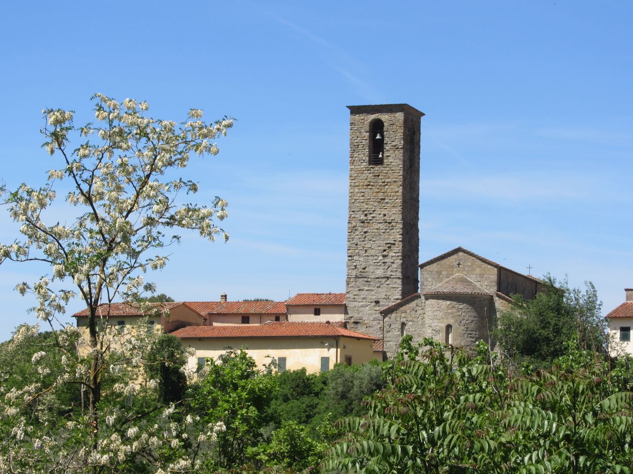 Unser Weg führt noch ein Teilstück am Arno entlang bis wir in Leccio auf die Strada Provenciala Satte Ponti wechseln. Ein ganz tolle Straße, die auch von anderen Radlern genutzt wird. Die Akazien blühen gerade und der Duft der Blüten liegt über der Straße. Dann gibt es auch noch gelb blühenden Ginster und an einigen Stellen ragen Felsformationen aus dem Wald hervor. Die Anstiege sind hier recht moderat.