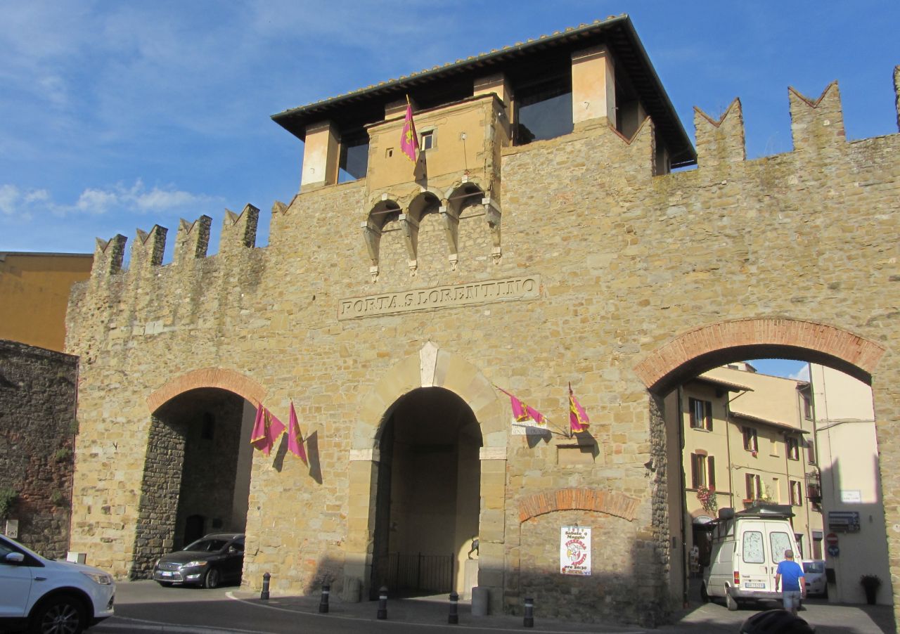 Und so erreichen wir wieder den Arno und bald darauf die Provinzhauptstadt Arezzo. Durch die Porta San Lorentino, als Teil der Stadtbefestigung, erreichen wir die Innenstadt. In einem Fahrradladen sucht Heinz nach Radschuhen, da er die zuhause vergessen hat. Aber die Italiener haben kleine Füße; Größe 44 sind hier schon Riesenfüße und die Größe ist nicht verfügbar; und so bleibts beim Heinz bei den Turnschuhen.