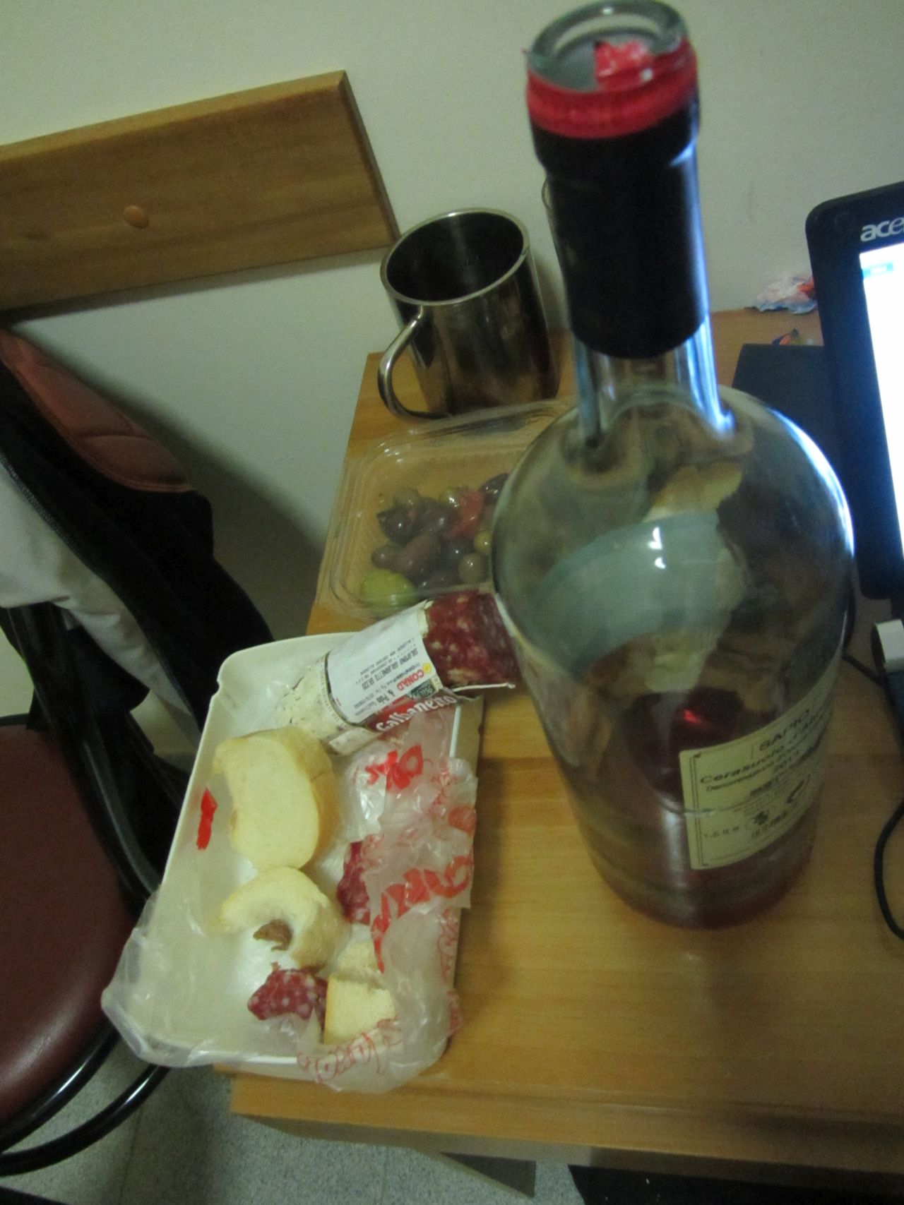 Hier gibt es internes und rares Foto, das zeigt, wie der Tourenbericht erstellt wird. Der Inhalt der Rotweinflasche neigt sich dem Ende; eine leckere Salami liegt neben dem Rechner, etwas Brot und dann die Sammlung von dunklen und hellen Oliven beflügelt die Gedanken. Dies inspiriert und lässt die Finger schneller über die Tastatur gleiten.