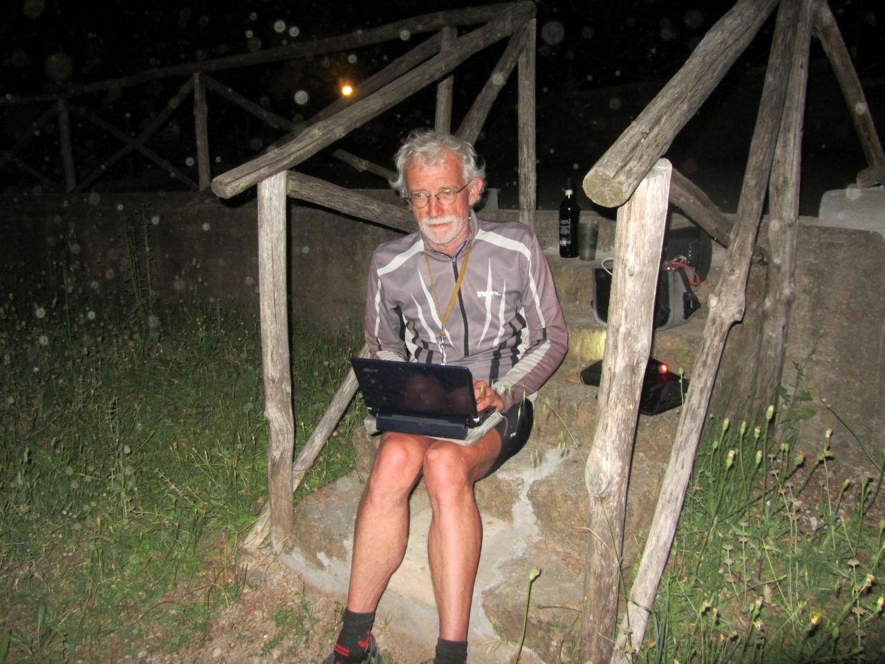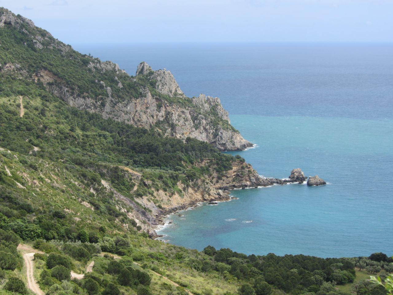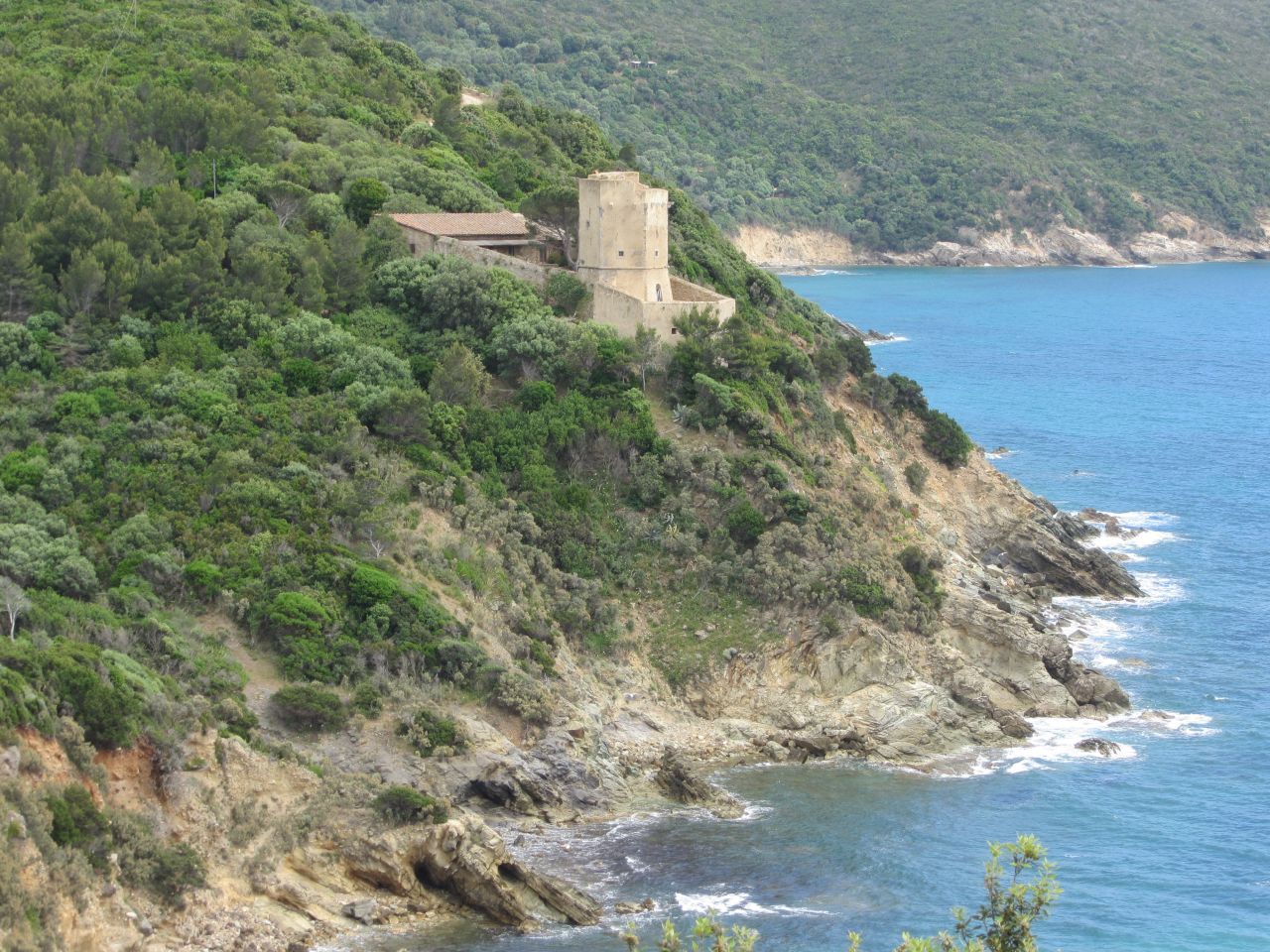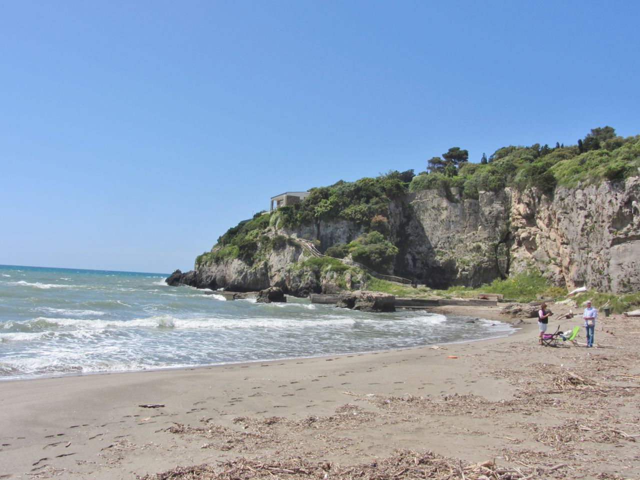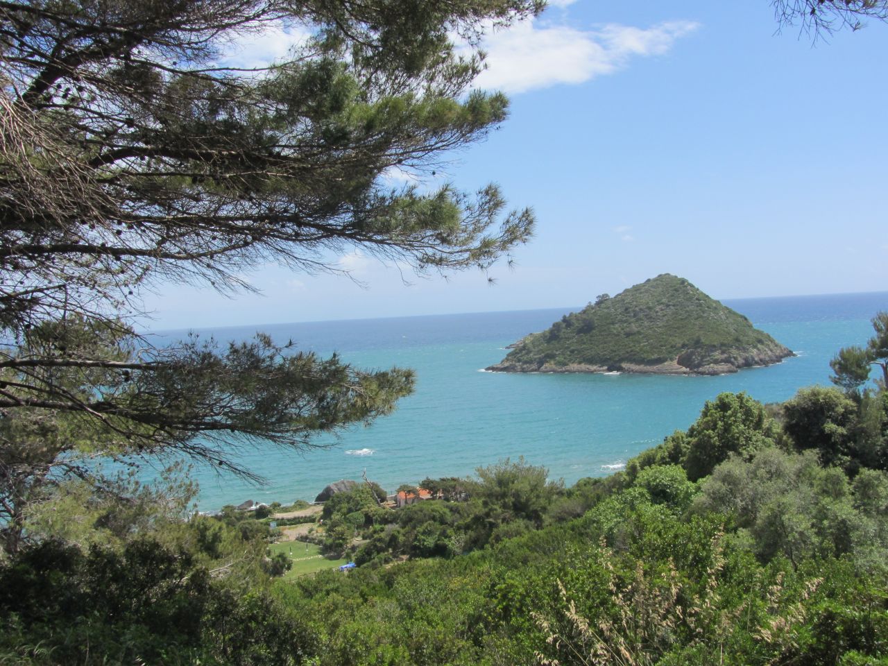 Zuerst haben wir einen flachen Küstenverlauf. In Ansedonia treffen wir auf eine Steilküste und vor dem Bergmassiv baden wir im Thyrrenischen Meer. Wir sind die Einzigsten bei der geschätzten Wassertemperatur von 18 °C, die sich ins Wasser stürzen. Der Wellengang ist recht heftig und der Sand sammelt sich in der Badehose. Danach kommen wir durch den Ort Orbetello und dann landen wir auf der Halbinsel des Monte Argentario.