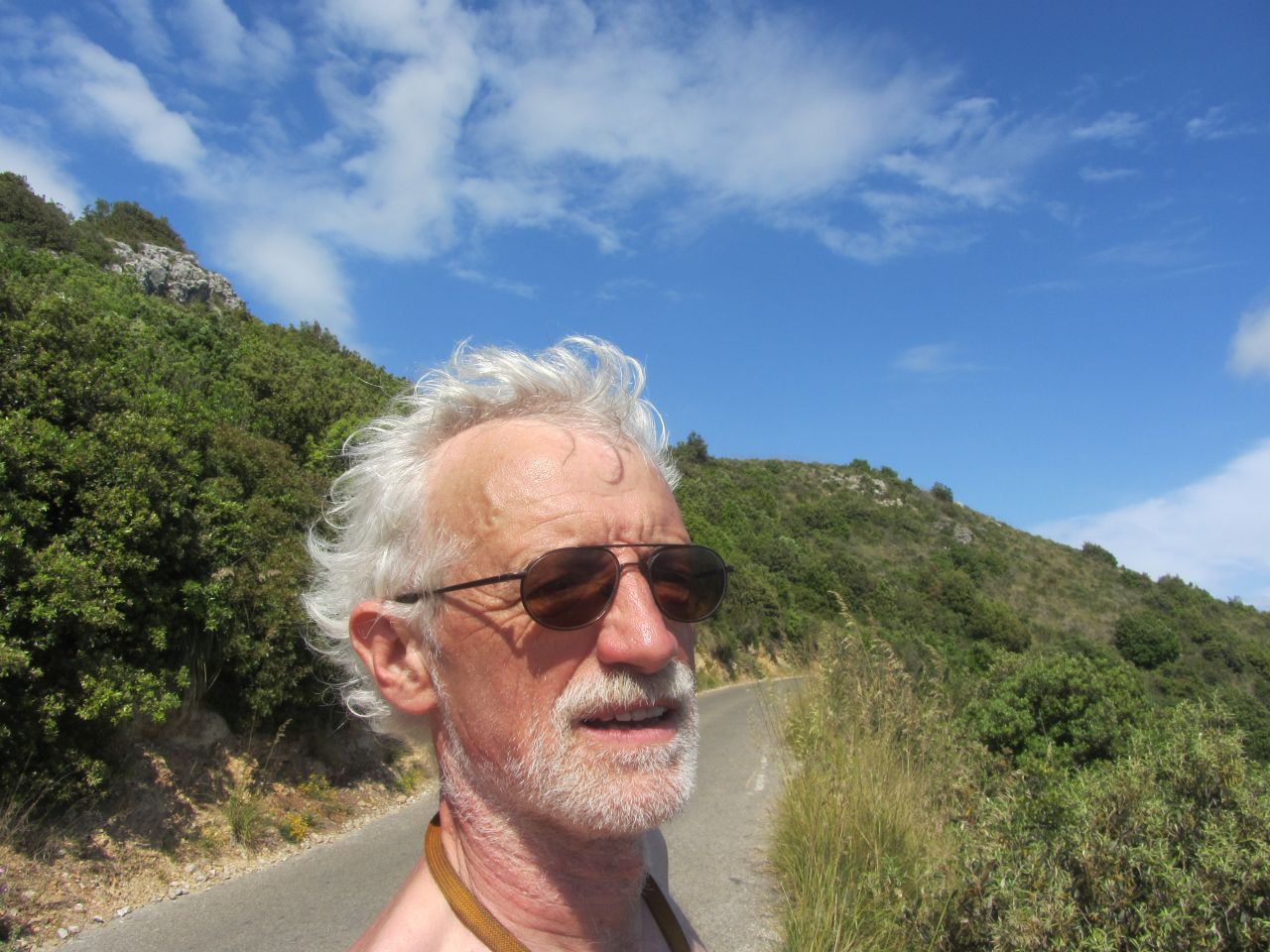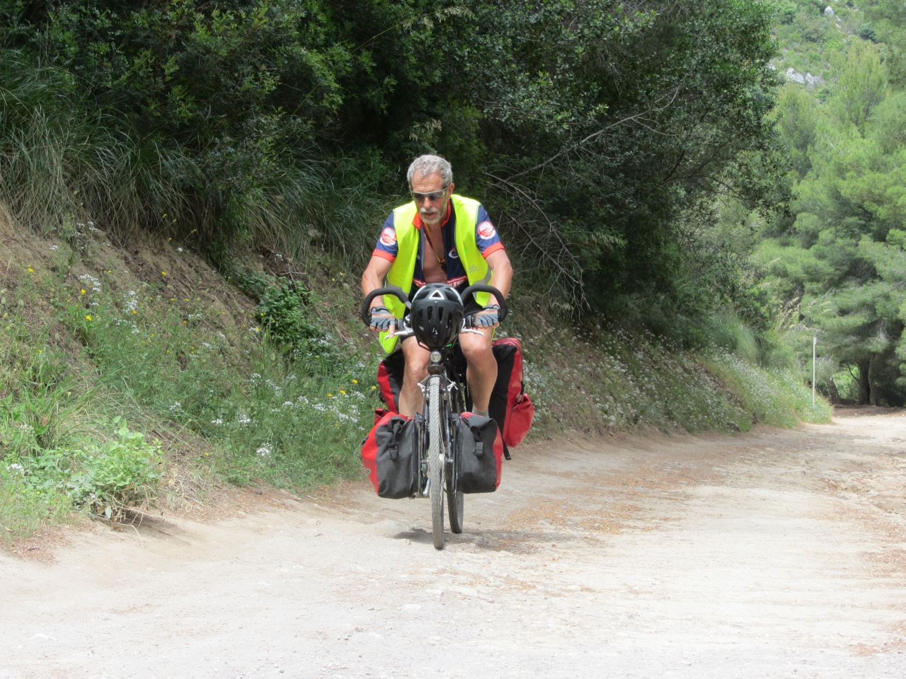 Es folgt einePassage mit unbefestigem Weg und enormen Steigungen, wir haben mal bis 20% Steigung geschätzt, die nur durch Schieben zu nehmen sind; aber nur so gerade….Dafür gibt es keinen Autoverkehr und selbst Mountainbiker treffen wir hier nicht an; nur zwei verrückte Reiseradler aus Bochum.