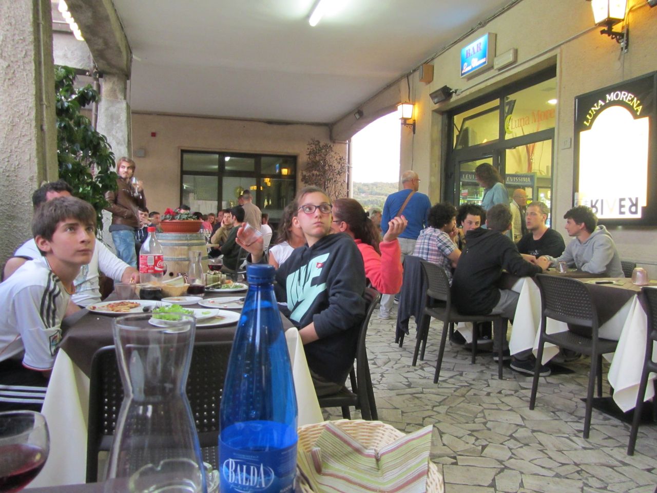 In Fonteblanda gehen wir erst einmal gut essen. Am Samstagabend halten sich viel Italiener in dem Lokal zum Essen auf. Die Italiener schauen hier gespannt auf die Leinwand; Inter spielt gegen Juventus, während wir uns den Meeresfrüchten widmen.