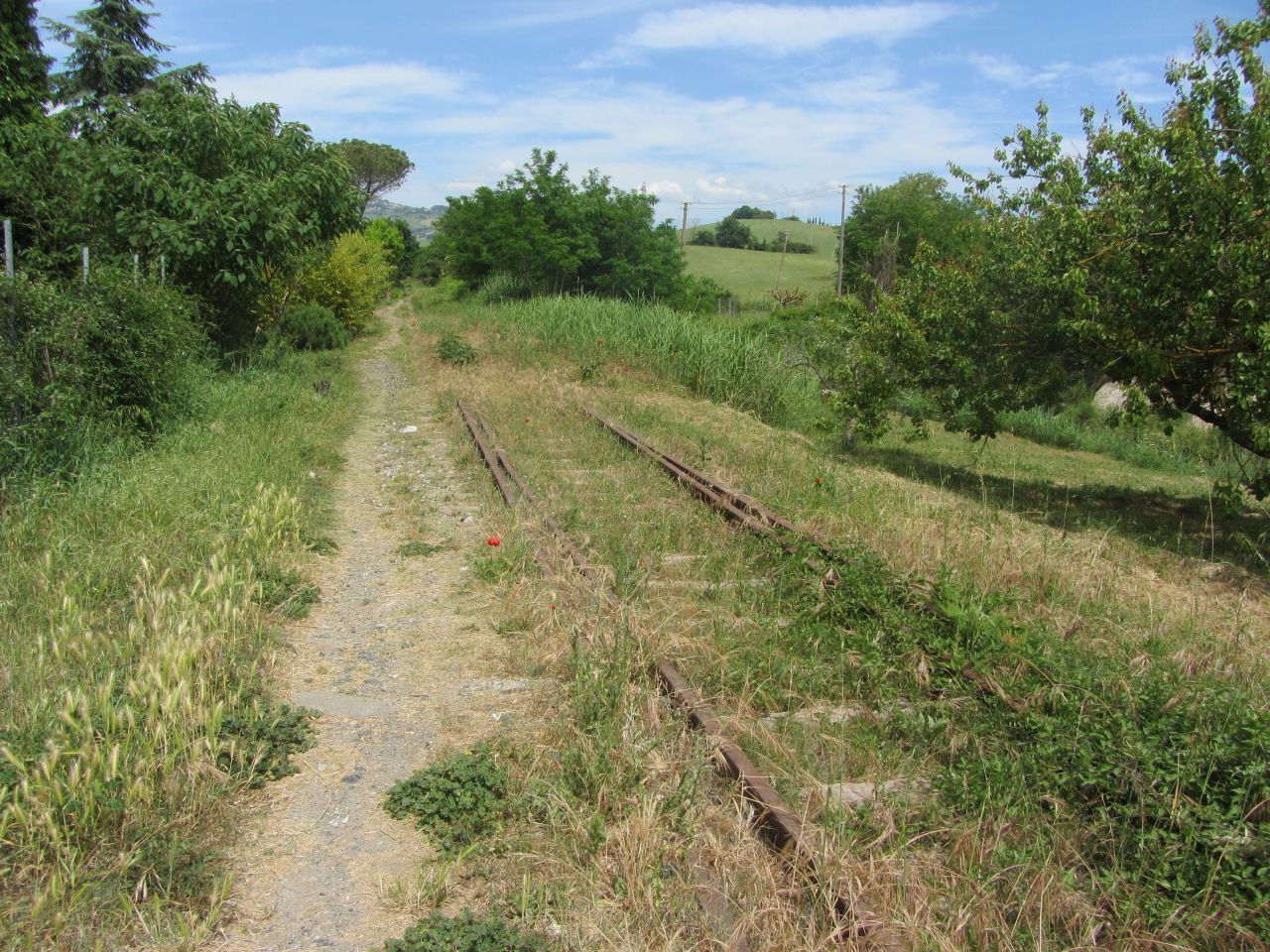 Parallel zu der Straße gibt eine Eisenbahnlinie. Das Gras wuchert schon auf dem Gleiskörper, aber ein Zug fährt noch bis Saline di Volterra.