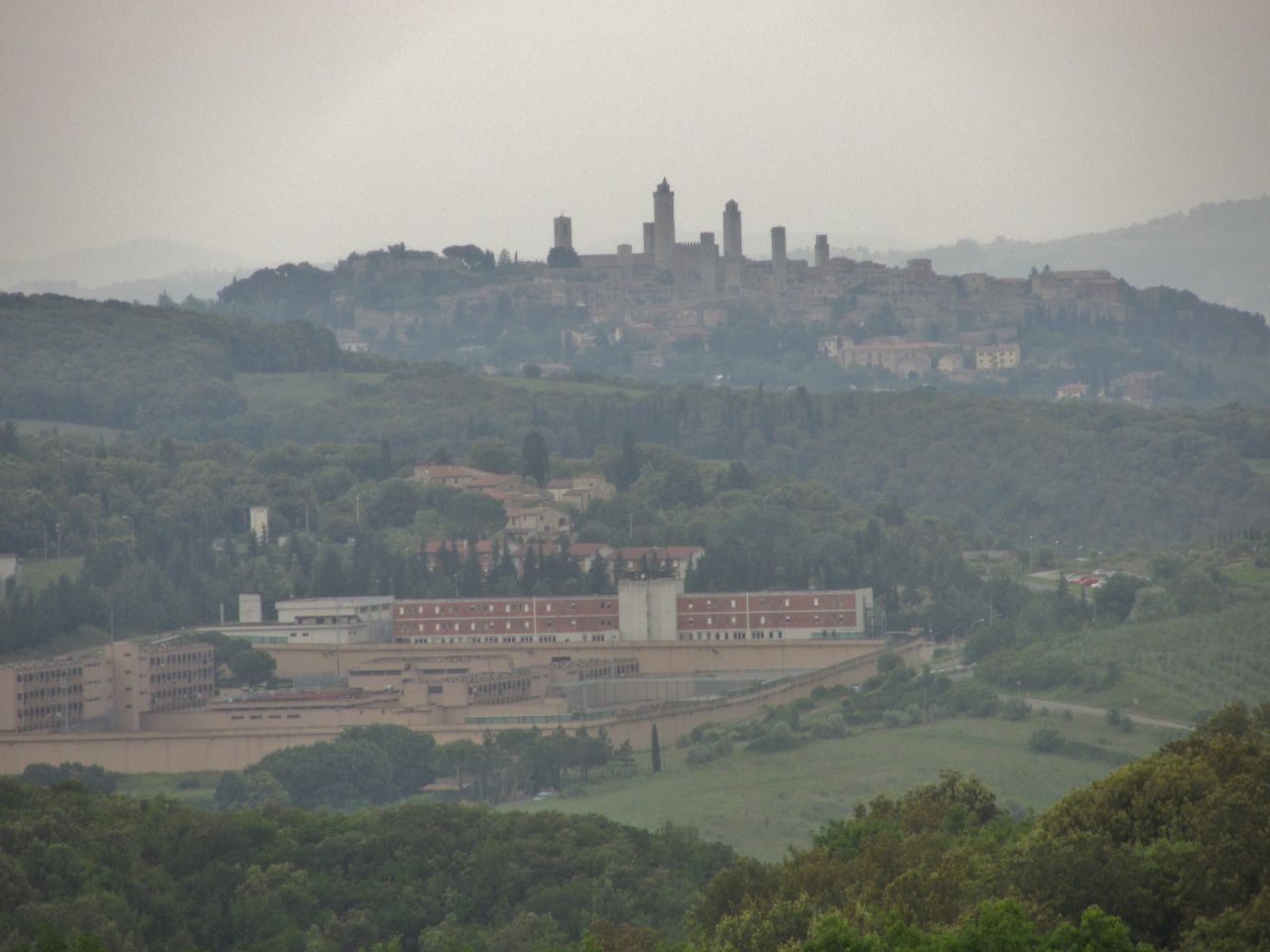 Wir fahren in östlicher Richtung auf der SR68, und dann sieht man von weitem hohe Türme auf einem Bergmassiv. Davor eine große moderne Gebäudeanlage. Bei näherer Betrachtung erkennen wir die letzte als Gefängniskomplex und der Ort auf der Bergspitze ist San Gimignano, unsere nächste angepeilte Zwischenstation. Vor dem Ort gibt es schon große Busparkplätze, um die Altstadt vom Verkehr zu entlasten.