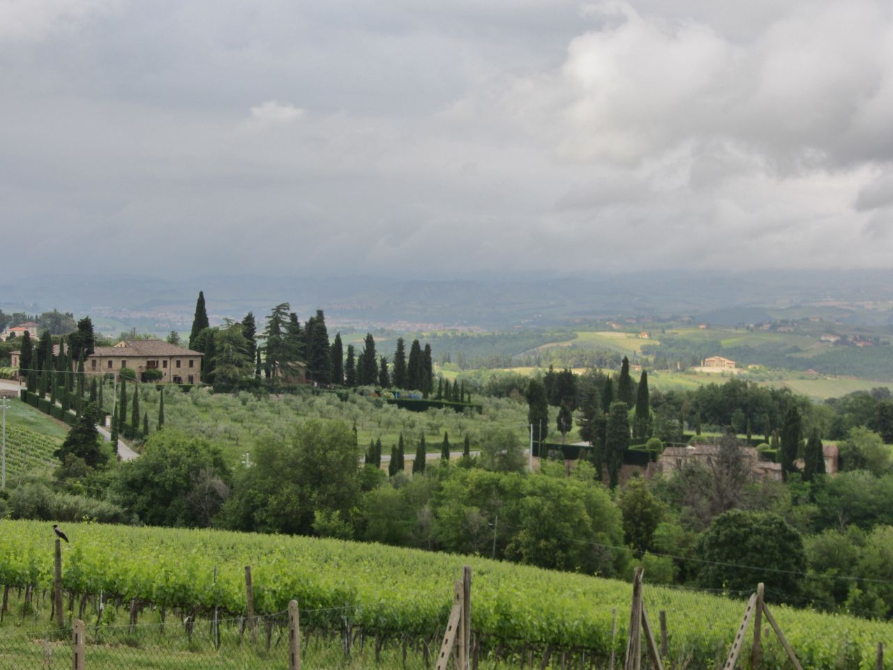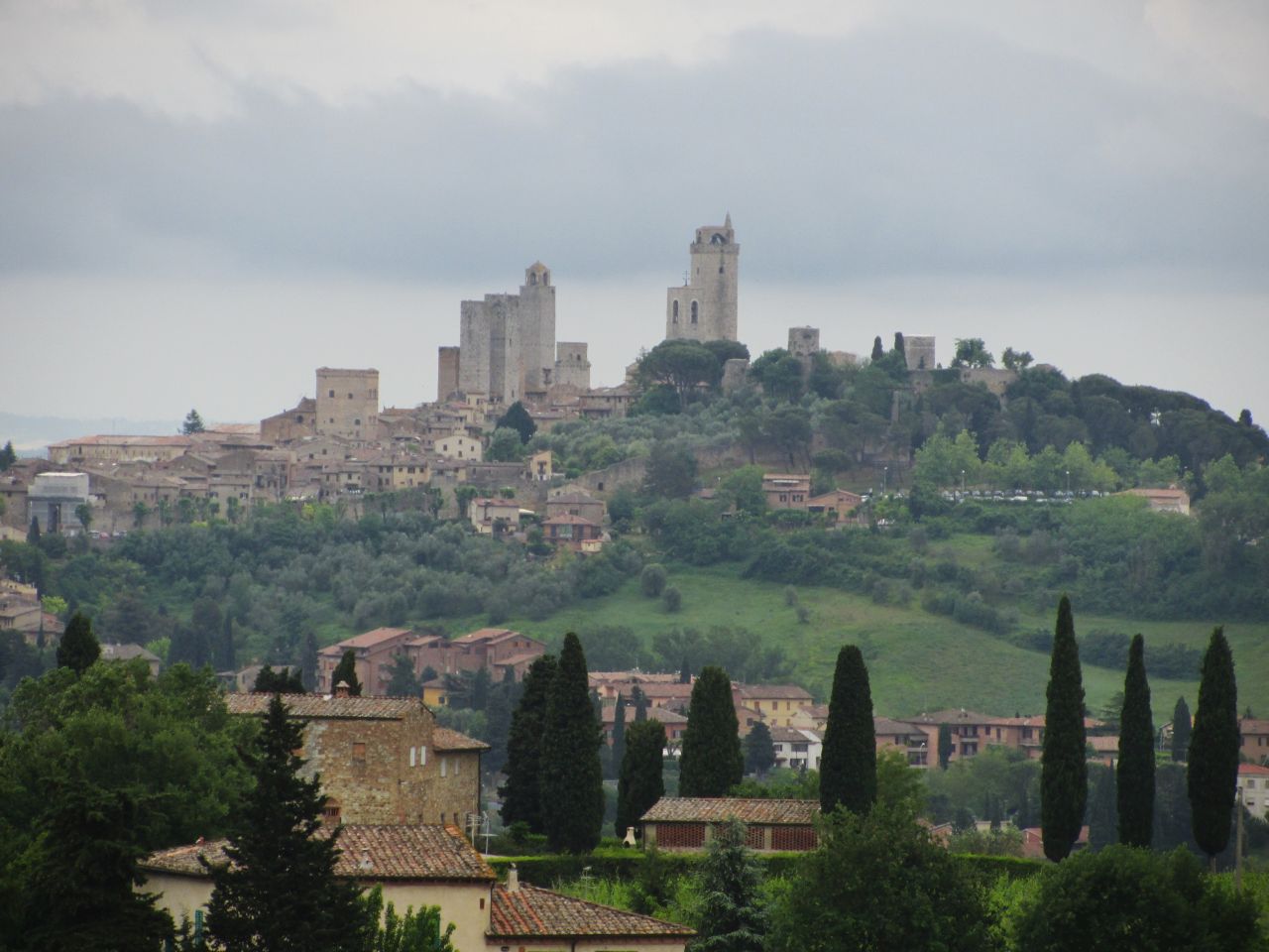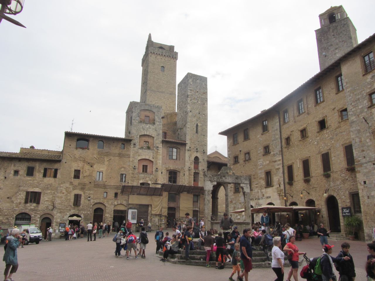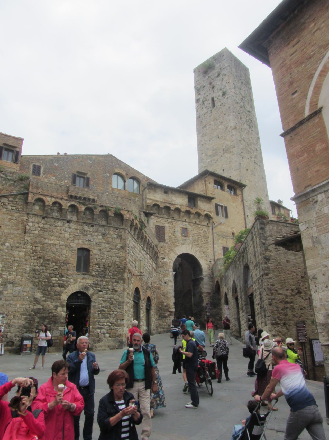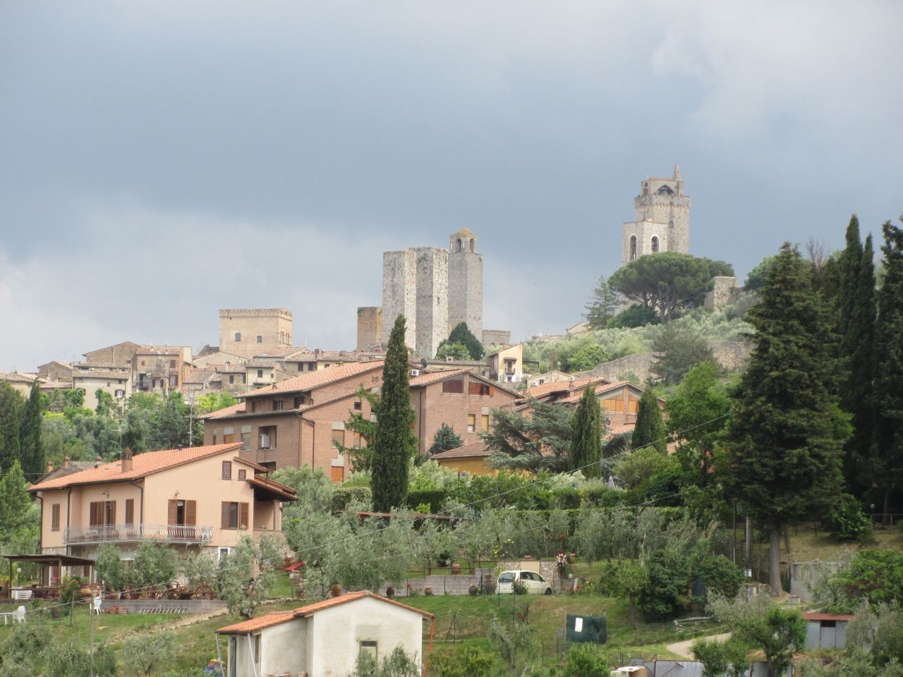 Wir haben uns natürlich schlau gemacht: was heute der Porsche vor dem Haus ist war damals der Turm am Haus. Die Bewohner haben sich gegenseitig bezüglich der Höhe ihrer Türme ausgestochen. Der Ort lag auf dem Frankenhandelsweg, bis die umgebenden Sümpfe trockengelegt wurden. Dann musste man nicht mehr auf die Berge klettern. San Gimignano verlor seine Bedeutung als Ort auf dem Handelsweg. Außerdem lag der Ort dann im Machtbereich von Florenz, und die Herrscher gaben lieber das Geld für den Ausbau von Florenz aus. als San Gimignano zu subventionieren.
