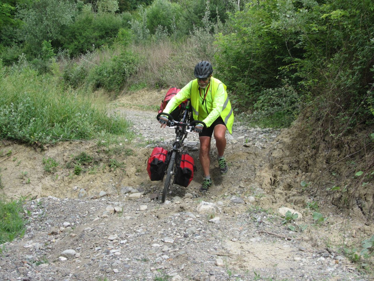 Wir fahren durch Pancole und danach hat Rainer einen unbefestigten „Fahrradweg“ als Track ausgewählt. Heinz musste erst einmal überredet werden, den Weg zu nehmen. Anfangs ging es bergab, das schafft man auch bei einem Geröllweg. Dann ist der Weg an dem Ufer eines Baches auch noch abgerutscht, da kommt man nur noch mit dem Rad durch.