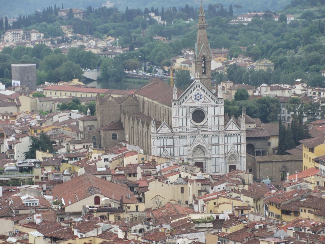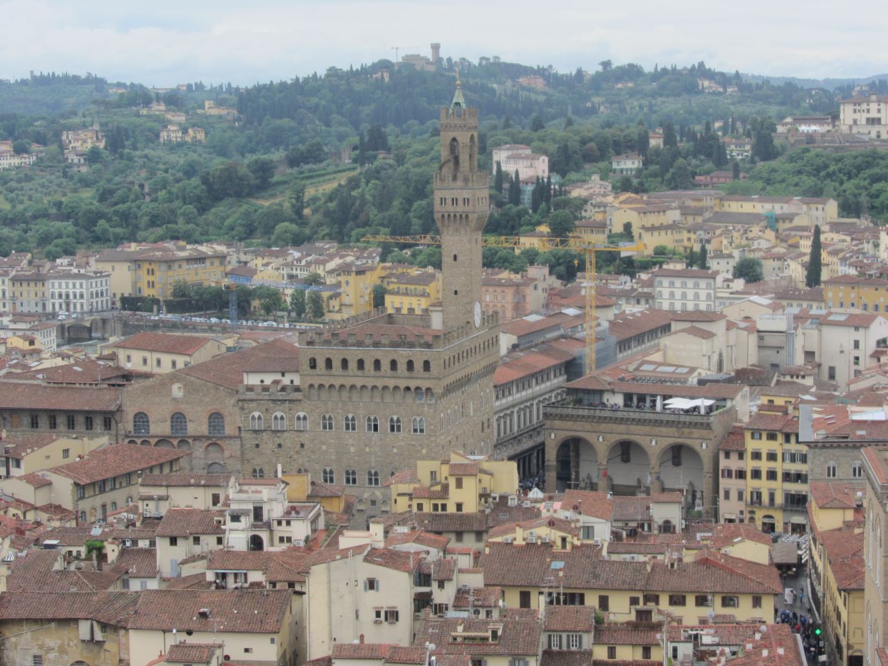 Wir steigen erst einmal auf den Turm, um einen Überblick über Florenz zu gewinnen. Von hier kann man auf die benachbarte Basikica di San Lorenzo schauen.