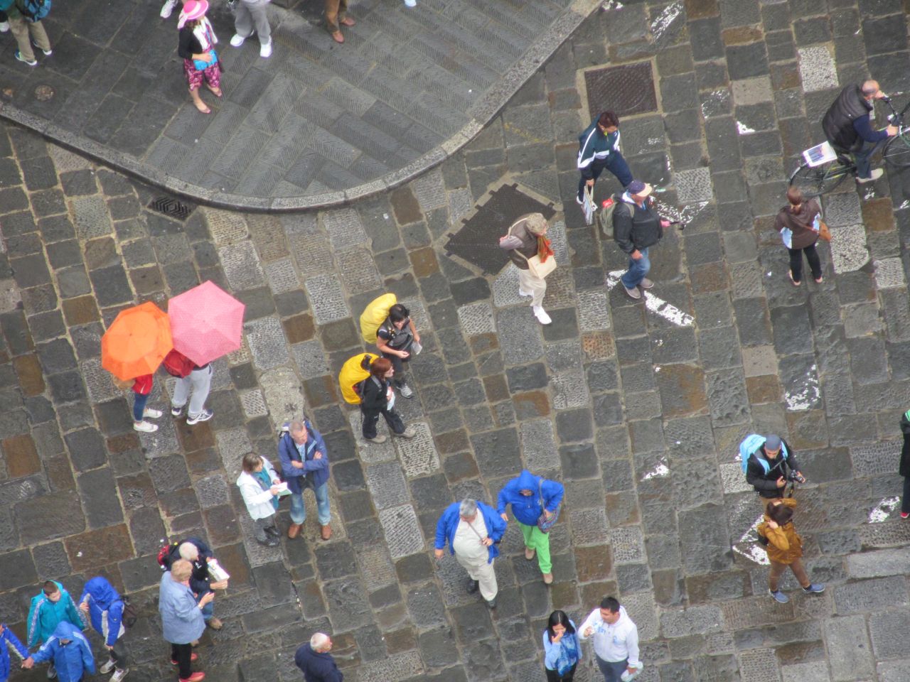 Die Menschen unen wirken schon recht klein und die Regenschirme zeigen, dass auch heute etwas Regen angesagt ist.