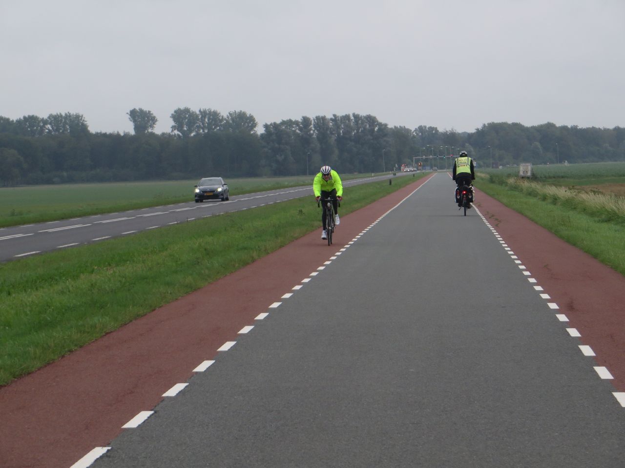 Es geht dann auf einer schnurgraden Straße nach Kampen. Auffällig die fahrradfreundliche Trassierung auf einer gesonderten Straße mit breiten rot eingefärbten Angebotsspuren.